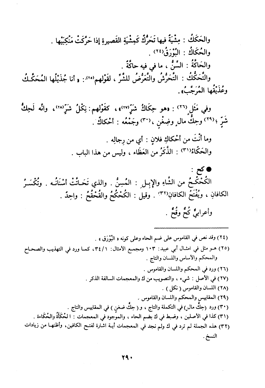 والحَكَكُ : مِشْيَةٌ فيها تَحَرُّكٌ كَمِشْيَةِ القَصيرةِ إذا حَرَّكَتْ مَنْكِبَيْها . والحُكَاكُ : البُوْرَقُ . الحَاكَّةُ : السِّنُّ ، ما في فيه حاكَّةٌ . والتَّحَكُّكُ : التَّحَرُّشُ والتَّعَرُّضُ للشَّرِّ ، لقَوْلهم : أنا جُذيْلُها المُحَكَّكُ وعُذَيْقُها المُرَجَّبُ . وفي مَثَلٍ : هو حِكَاكُ شَرٍّ ، كقَوْلهم : نِكْلُ شَرٍّ ، وانَّه لَحِكُّ شَرٍّ ، وحِكُّ مالٍ وضِغْنٍ ، وجَمْعُه : أحْكاكٌ . وما أنت من أحْكاكِ فلانٍ : أي من رِجالِه . والحَكّاءُ : الذَكَرُ من العَظَاء ، وليس من هذا الباب . كح الكُحْكُحُ من الشَّاءِ والإِبِلِ : المُسِنُّ . والذي تَحَاتَّتْ أسْنَانُه . وتُكْسَرُ الكافانِ ، ويُفْتَحُ الكافانِ . وقيل : الكُحْكُحُ والقُحْقُحُ : واحِدٌ . وأعرابيٌّ كُحٌّ وقُحٌّ .