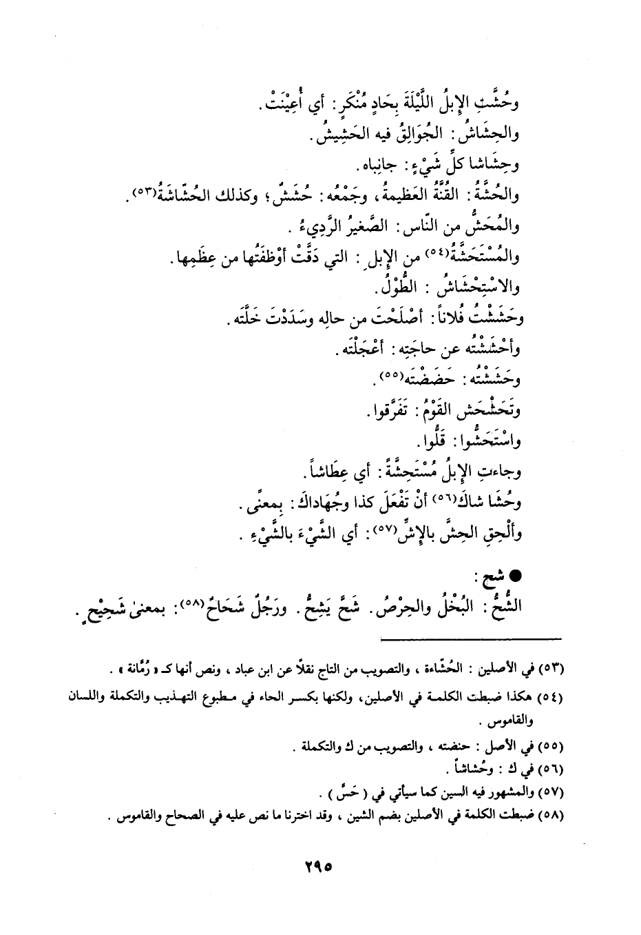 وحُشَّتِ الإِبلُ اللَّيْلَةَ بِحَادٍ مُنْكَرٍ : أي أُعِيْنَتْ . والحِشَاشُ : الجُوَالقُ فيه الحَشيشُ . وحِشَاشا كلِّ شَيْءٍ : جانِباه . والحُشَّةُ : القُنّةُ العَظيمةُ ، وجَمْعُه : حُشَشٌ ، وكذلك الحُشَاشَةُ . والمُحَشُّ من النّاس : الصَّغيرُ الرَّدِيءُ . والمُسْتَحَشَّةُ من الإبلِ : التي دَقَّتْ أوْظفَتُها من عِظَمِها . والاسْتِحْشَاشُ : الطُّوْلُ . وحَشَشْتُ فُلاناً : أصْلَحْتَ من حالِه وسَدَدْتَ خَلَّتَه . وأحْشَشْتُه عن حاجَتِه : أعْجَلْتَه . وحَشَشْتُه : حَضَضْتَه . وتَحَشْحَش القَوْمُ : تَفَرَّقوا . واسْتَحَشُّوا : قَلُّوا . وجاءتِ الإِبلُ مُسْتَحِشَّةً : أي عِطَاشاً . وحُشَا شاكَ أنْ تَفْعَلَ كذا وجُهَاداكَ : بِمعنىً . وألْحِقِ الحِشَّ بالإشِّ : أي الشّيءَ بالشيءِ . شح الشُّحُّ : البُخْلُ والحِرْصُ . شَحَّ يَشِحُّ . ورَجُلٌ شَحَاحٌ : بمعنى شَحِيْحٍ .