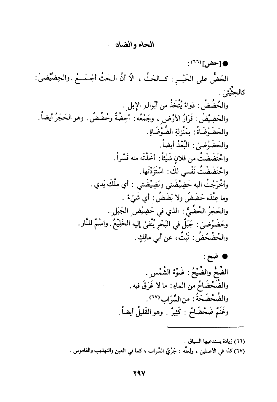حض الحَضُّ على الخَيْرِ : كالحَثِّ ، إلاّ أنَّ الحَثَّ أجْمَعُ . والحِضِّيْضى : كالحِثِّيْثى . والحُضُضُ : دَواءٌ يُتَّخَذُ من أبْوالِ الإبل . والحَضِيَضُ : قَرَارُ الأرْضِ ، وجَمْعُه : أحِضَّةٌ وحُضُضٌ . وهو الحَجَرُ أيضاً . والحَضَوْضَاةُ : بمَنْزلةِ الضَّوْضَاةُ . والحَضَوْضى : البُعْدُ أيضاً . واحْتَضَضْتُ من فلانٍ شَيْئاً : اخَذْتَه منه قَسْراً . واحْتَضَضْتُ نَفْسي لكَ : استَزدْتَها . وأخْرَجْتُ إليه حَضِيْضَتي وبَضيْضَتي : أي مِلْكَ يَدي . وما عِندَه حَضَضٌ ولا بَضَضٌ : أي شَيءٌ . والحَجَرُ الحُضِّيُّ : الذي في حَضِيْضِ الجَبَلِ . وحَضَوْضى : جَبَلٌ في البَحْرِ يُنْفى إليه الخَلِيْعُ . واسْمٌ للنَّار . والحُضْحُضُ : نَبْتٌ ، عن أبي مالِكٍ . ضح الضِّحُّ والضِّيْحُ : ضَوْءُ الشَّمْسِ . والضَّحْضَاحُ من الماءِ : ما لا غَرَقَ فيه . والضَّحْضَحَةُ : من السراب . وغَنَمٌ ضَحْضَاحٌ : كَثِيرٌ . وهو القَليلُ أيضاً .