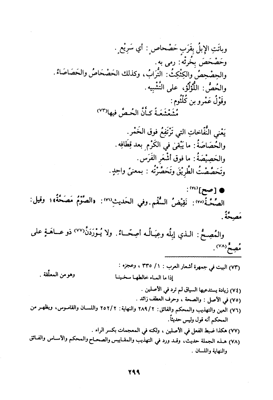 وباتَتِ الإِبلُ بِقَرَبٍ حَصْحاصٍ : أي سَرِيْعٍ . وحَصْحَصَ بِخُرْئه : رمى به . والحِصْحِصُ والكِثْكِثُ : التُّرَابُ ، وكذلك الحَصْحَاصُ والحَصَاصَاءُ . والحُصُّ : اللُّؤْلُؤْ ، على التَّشْبِيه . وقول عَمْرو بن كُلْثُوم : مُشَعْشَعَةً كأَنَّ الحُصَّ فيها يَعْني النُّفّاخاتِ التي تَرْتَفِعُ فوق الخَمْر . والحُصَاصَةُ : ما يَبْقى في الكَرْمِ بعد قِطَافِه . والحَصِيْصَةُ : ما فوق أشْعَرِ الفَرَس . وتَحَصَّصْتُ الطَّرِيْقَ وتَحَصَّرْتُه : بمعنىً واحِدٍ . صح الصِّحَّةُ : نَقِيْضُ السُّقْم . وفي الحَديثِ : الصَّوْمُ مَصَحَّةٌ ، وقيل مَصِحَّةٌ . والمُصِحُّ : الذي إبِلُه وعِيَالُه أصِحّاءُ . ولا يُوْرَدَنَّ ذو عاهَةٍ على مُصِحٍّ .