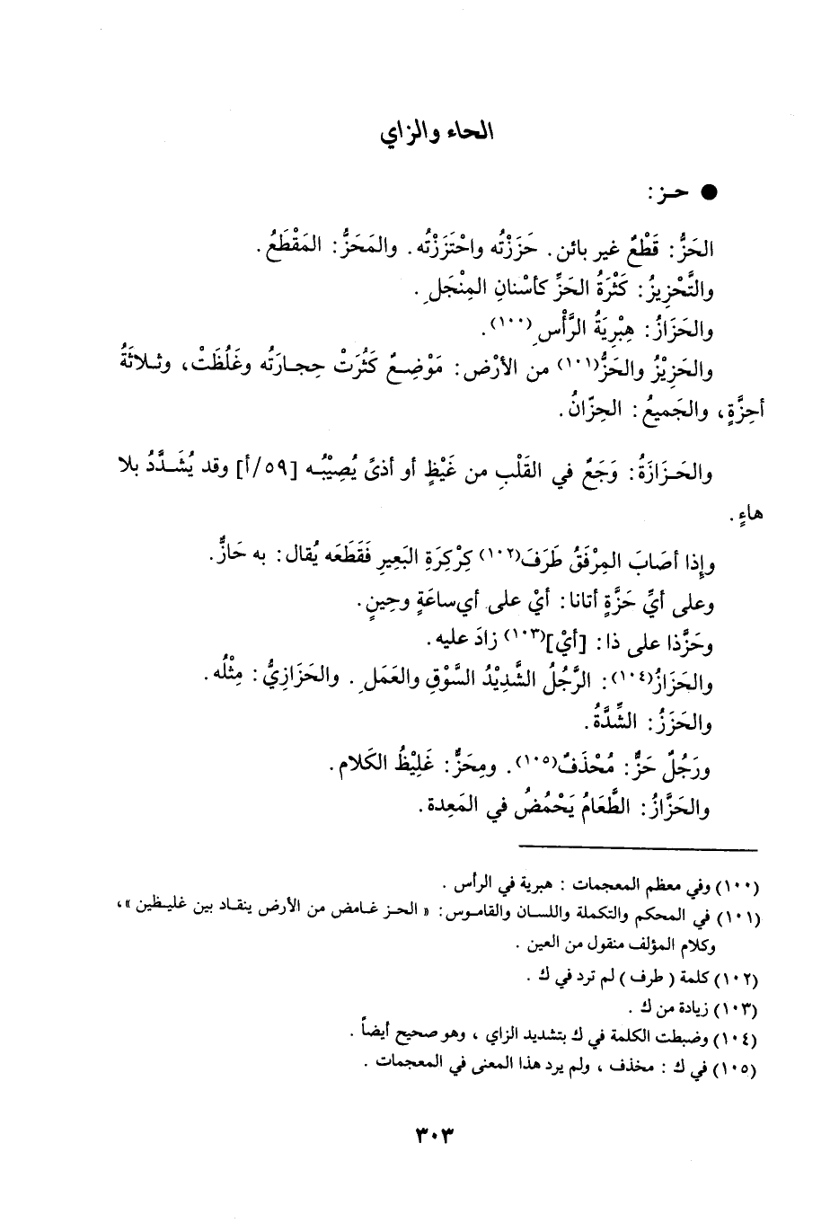 حز الحَزُّ : قَطْعٌ غير بائن . حَزَزْتُه واحْتَزَزْتُه . والمَحَزُّ : المَقْطَعُ . والتَّحْزِيزُ : كَثْرَةُ الحَزِّ كأسْنانِ المِنْجَلِ . والحَزَازُ : هِبْرِيَةُ الرَّأْسِ . والحَزِيْزُ والحَزُّ من الأرْض : مَوْضِعٌ كَثُرَتْ حِجارَتُه وغَلُظَتْ ، وثلاثَةُ أحِزَّةٍ ، والجَميعُ : الحِزّانُ . والحَزَازَةُ : وَجَعٌ في القَلْبِ من غَيْظٍ أو أذىً يُصِيْبُه وقد يُشَدَّدُ بلا هاءٍ . وإذا أصَابَ المِرْفَقُ طَرَفَ كِرْكِرَةِ البَعِيرِ فَقَطَعَه يُقال : به حَازٌّ . وعلى أيِّ حَزَّةٍ أتانا : أيْ على أي ساعَةٍ وحِينٍ . وحَزَّذا على ذا : أيْ زادَ عليه . والحَزَازُ : الرَّجُلُ الشَّدِيْدُ السَّوْقِ والعَمَلِ . والحَزَازِيُّ : مِثْلُه . والحَزَزُ : الشِّدَّةُ . ورَجُلٌ حَزٌّ : مُحْذَفٌ . ومِحَزٌّ : غَلِيْظُ الكَلام . والحَزَّازُ : الطَّعَامُ يَحْمُضُ في المَعِدة .