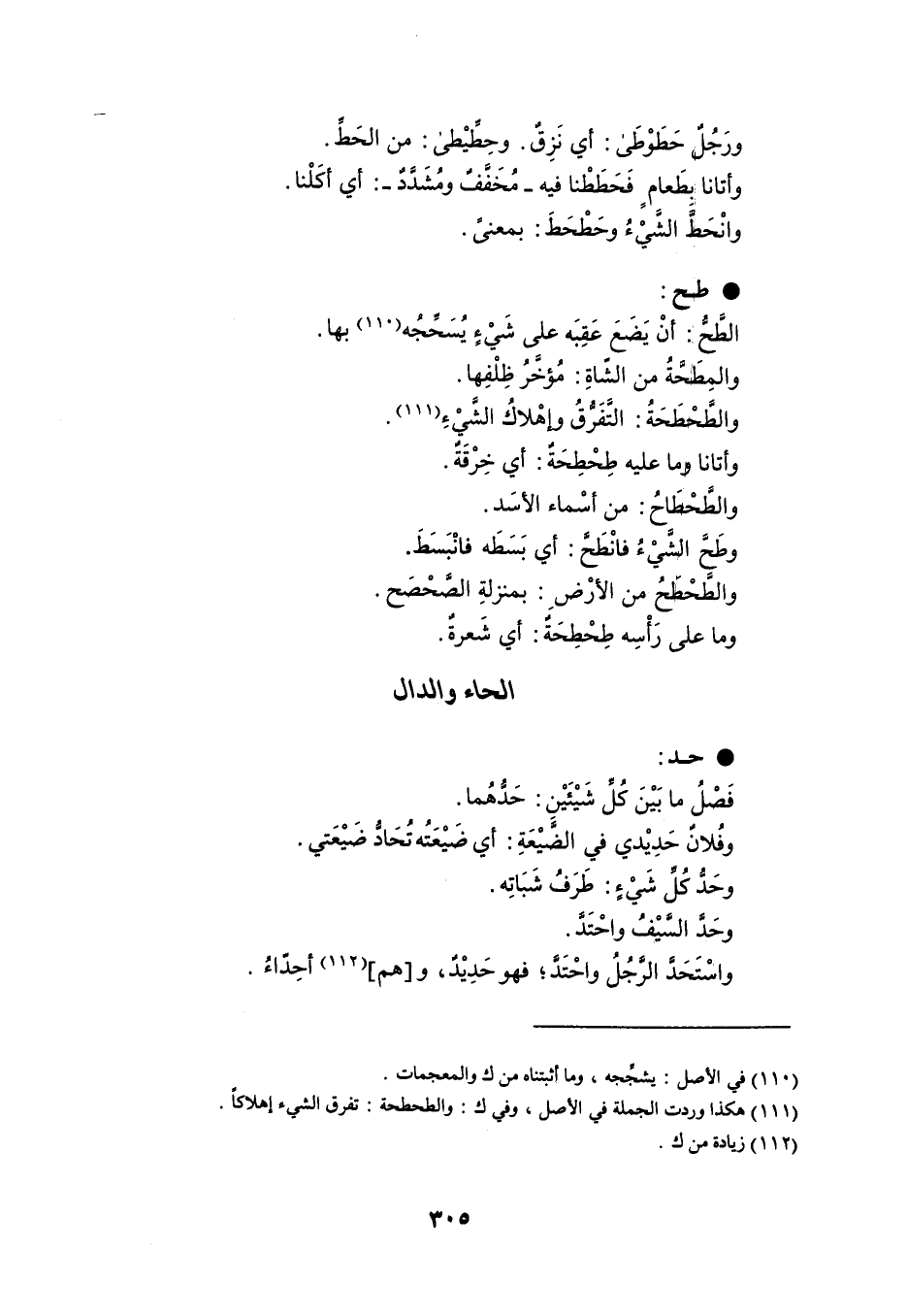 ورَجُلٌ حَطَوْطَى : أي نَزِقٌ . وحِطِّيْطى : من الحَطِّ . وأتانا بطعام فَحَططْنا فيه - مُخَفَّفٌ ومُشَدَّدٌ - : أي أكَلْنا . وانْحَطَّ الشيْءُ وحَطْحَطَ : بمعنى . طح الطَّحُّ : أنْ يَضَعَ عَقِبَه على شَيْءٍ يُسَحِّجُه بها . والمِطَحَّةُ من الشّاةِ : مُؤخَّرُ ظِلْفِها . والطَّحْطَحَةُ : التَّفَرُّقُ وإهْلاكُ الشَّيْءِ . وأتانا وما عليه طِحْطِحَةٌ : أي خِرْقَةٌ . والطَّحْطَحُ من الأرْضِ : بمنزلةِ الصَّحْصَح . وما على رَأْسِه طِحْطِحَةٌ : أي شَعرةٌ .