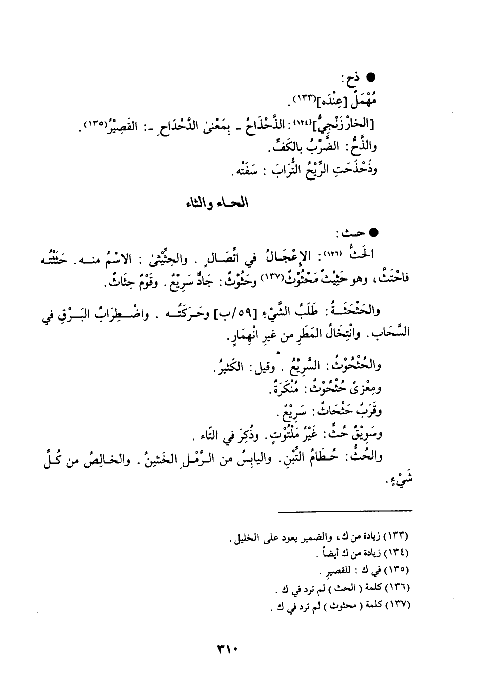 حث الحَثُّ : الإعْجالُ في اتِّصَالٍ . والحِثِّيْثى : الاسم منه . حَثَثْتُه فاحْتَثَّ ، وهوحَثِيْثٌ مَحْثُوْثٌ وحَثُوْثٌ : جَادٌّ سَرِيْعٌ . وقَوْمٌ حِثَاثٌ . والحَثْحَثَةُ : طَلَبُ الشَّيْءِ وحَرَكَتُه . واضْطِرابُ البَرْقِ في السَّحَاب . وانْتِخَال المَطَرِ من غيرِ انْهِمَارٍ . والحُثْحُوْثُ : السَّرِيْعُ . وقيل الكَثِيرُ . ومعزَى حُثْحُوثٌ : مُنْكَرَةٌ . وقَرَبٌ حَثْحَاثٌ : سَرِيْعٌ . وسَوِيْقٌ حُثٌّ : غَيْرُ مَلْتُوْتٍ . وذُكِرَ في التّاء . والحُثُّ : حُطَامُ التِّبْنِ . واليابِسُ من الرَّمْلِ الخَشِنُ . والخالِصُ من كل شَيْءٍ .