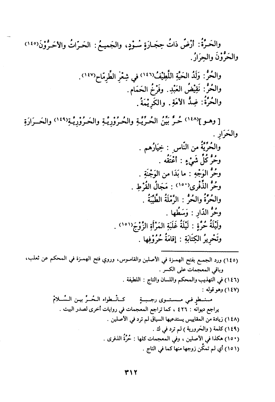 والحَرَّةُ : أرْضٌ ذاتُ حَجَارَةٍ سُوْدٍ ، والجَميعُ : الحَرّاتُ والأحَرُّوْنَ والحَرُّوْنَ والحِرَارُ . والحُرُّ : وَلَدُ الحَيَّةِ اللَّطِيْفُ في شِعْرِ الطِّرِمّاح . والحُرُّ : نَقِيْضُ العَبْدِ . وفَرْخُ الحَمَام . والحُرَّةُ : ضِدُّ الأمَةِ . والكَرِيْمَةُ . وهو حُرٌّ بَيِّنُ الحُرِّيَّةِ والحُرُوْرِيَّةِ والحَرورية والحَرَارَةِ والحَرَارِ . والحُرِّيَّةُ من النّاسِ : خِيَارُهم . وحُرُّ كُلِّ شَيْءٍ : أعْتَقُه . وحُرُّ الوَجْهِ : ما بَدَا من الوَجْنَةِ . وحُرُّ الذِفْرى : مَجَالُ القُرْطِ . والحُرَّةُ والحُرُّ : الرِّمْلَةُ الطَّيِّبَةُ . وحُرُّ الدّارِ : وَسَطُها . ولَيْلَةُ حُرَّةٍ : لَيْلَةُ غَلَبَةِ المَرْأَةِ الزَّوْجَ . وتَحْرِيرُ الكِتَابَةِ : إقامَةُ حُرُوْفِها .