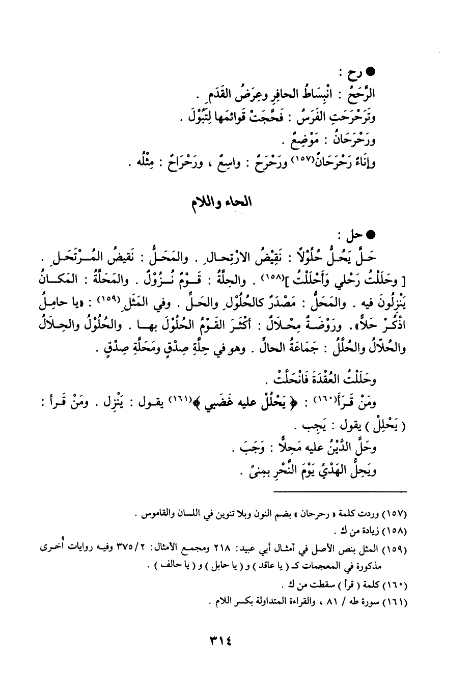 حل حَلَّ يَحُلُّ حُلُوْلاً : نَقِيْضُ الارْتِحالِ . والمَحَلُّ : نَقيضُ المُرْتَحَلِ . وحَلَلْتُ رَحْلي وَأَحْلَلْتُ . والحِلَّةُ : قَوْمٌ نُزُوْلٌ . والمَحَلَّةُ : المَكانُ يَنْزِلُونَ فيه . والمَحَلُّ : مَصدَرٌ كالحُلُوْلِ والحَلِّ . وفي المَثَلِ : يا حامِلُ اذْكُرْ حَلاً . ورَوْضَةٌ مِحْلاَلٌ : أكْثَرَ القَوْمُ الحُلُوْلَ بها . والحُلُوْلُ والحِلاَلُ والحُلاّلُ والحُلَّلُ : جَمَاعَةُ الحالِّ . وهو في حِلَّةِ صِدْقٍ ومَحَلَّةِ صِدْقٍ . وحَلَلْتُ العُقْدةَ فَانْحَلَّتْ . ومَنْ قَرَأ : ' يَحْلُلْ عليه غَضَبي ' يقول : يَنْزل . ومَنْ قَرأ : يَحْلِلْ يقول : يَجِب . وحَلَّ الدَّينُ عليه مَحِلاًّ : وَجَبَ . ويَحِلُّ الهَدْيُ يَوْمَ النَّحْرِ بمِنّى .