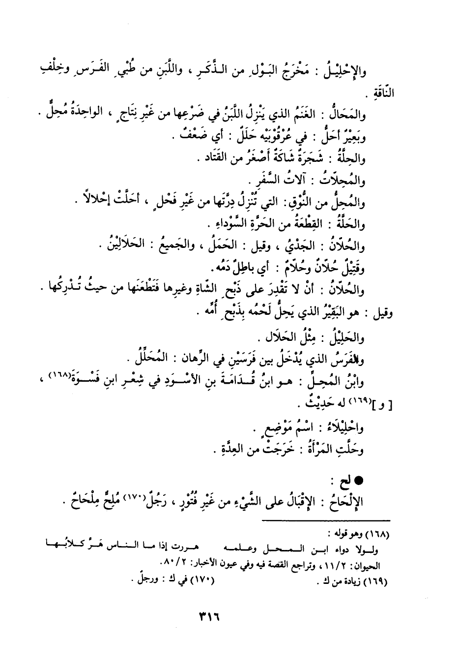والإحْلِيْلُ : مَخْرَجُ البَوْلِ من الذَّكَرِ ، واللَّبَنِ من طُبْيِ الفَرَسِ وخِلْفِ النّاقَةِ . والمَحَالُّ : الغَنَمُ الذي يَنْزِلُ اللَّبَنُ في ضَرْعِها من غَيْرِ نِتَاجٍ ، الواحِدَةُ مُحِلٌّ . وبَعِيْرٌ أحَلُّ : في عُرْقُوْبَيْه حَلَلٌ : أي ضَعْفٌ . والحِلَّةُ : شَجَرَةٌ شَاكَّةٌ أَصْغَرُ من القَتَاد . والمُحِلاتُ : آلاتُ السَّفَرِ . والمُحِلُّ من النُّوْقِ : التي تُنْزِلُ دِرَّتها من غَيْر فَحْلٍ ، أحَلَّت إحْلالاً . والحَلَّةُ : القِطْعَةُ من الحَرَّةِ السَّوْداء . والحُلانُ : الجَدْيُ ، وقيل : الحَمَلُ ، والجَميعُ : الحَلاَلِيْنُ . وقَتِيْلٌ حُلاّنٌ وحُلاّمٌ أي باطِلٌ دَمُه . والخُلاَّنُ : أنْ لا تَقْدِرَ على ذَبْحِ الشّاةِ وغيرِها فَتَطْعَنَها من حيثُ تُدرِكُها . وقيل : هو البَقِيْرُ الذي يَحِلُّ لَحْمُه بِذَبْحِ أُمِّه . والحَلِيْلُ : مِثْلُ الحَلاَل . والفَرَسُ الذي يُدْخَلُ بين فَرَسَيْنِ في الرِّهان : المُحَلِّلُ . وابْنُ المُحِلِّ : هو ابنُ قُدَامَةَ بنِ الأسْوَدِ في شِعْرِ ابن فَسْوَةَ ، و له حَدِيْثٌ . واحْلِيْلاَءُ : اسْمُ مَوْضِعٍ . وحَلَّتِ المَرْأَةُ : خَرَجَتْ من العِدَّةِ . لح الإِلْحَاحُ : الإِقْبَالُ على الشَّيْءِ من غَيرِ فُتُوْرٍ ، رَجُلٌ مُلِحٌّ مِلْحَاحٌ .