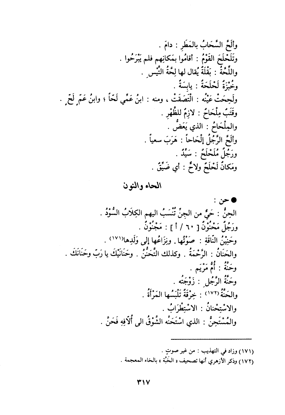 حن الحِنُّ : حَيٌّ من الجِنِّ تُنْسَبُ إليهم الكِلاَبُ السُّوْدُ . ورَجُلٌ مَحْنُوْنٌ : مَجْنُوْنٌ . وحَنِيْنُ النّاقَةِ : صَوْتُها . ونِزَاعُها إلى وَلَدِها . والحَنَانُ : الرَّحْمَةُ . وكذلك التَّحَنُّنُ . وحَنَانَيْكَ يا رَبّ وحَنَانَكَ . وحَنَّةُ : أُمُّ مَرْيَم . وحَنَّةُ الرَّجُلِ : زَوْجَتُه . والحَنَّةُ : خِرْقَةٌ تَلْبَسُها المَرْأَةُ . والاسْتِحْنانُ : الاسْتِطْرَابُ . والمُسْتَحِنُّ : الذي اسْتَحَنَّه الشَّوْقُ إلى أُلاّفِهِ فَحَنَّ .