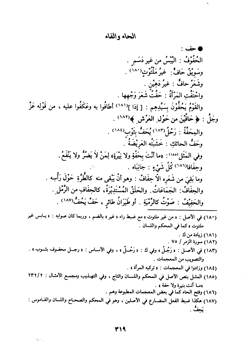 حف الحُفُوْفُ : اليُبْسُ من غير دَسَمٍ . وسَوِيْقٌ حَافٌّ : غيرُ مًلْتُوْتٍ . وشَعَرٌ حافٌّ : غيرُ دَهِيْنٍ . واحْتَفَّتِ المَرْأَةُ : حَفَّتْ شَعَرَ وَجْهِها . والقَوْمُ يُحُفُّوْنَ بِسَيِّدِهِم : إذا أطافُوا به وعَكَفُوا عليه ، من قَوْلِه عَزَّ وجَلَّ : ' حَافِّيْنَ من حَوْلِ العَرْشِ ' . والمِحَفَّةُ : رَحْلٌ يُحَفُّ بِثَوْبٍ . وحَفُّ الحائكِ : خَشَبَتُه العَرِيْضَةُ . وفي المَثَل : ما أنْتَ بِحَفَّةٍ ولا نِيْرَةٍ لِمَنْ لا يَضُرُّ ولا يَنْفَعُ . وحِفَافا كُلِّ شَيْءٍ : جانِبَاه . وما بَقِيَ من شَعَرِه الاّ حِفَافٌ : وهو أنْ يَبْقى منه كالطُّرَّةِ حَوْلَ رَأْسِه . والحِفَافُ : الجَمَاعَاتُ . والحَلَقُ المُسْتَدِيْرَةُ ، كالحِفَافِ من الرَّمْلِ . والحَفِيْفُ : صَوْتٌ كالرَّمْيَةِ . أو طَيَرَانُ طائرٍ ، حَفَّ يَحُفُّ .