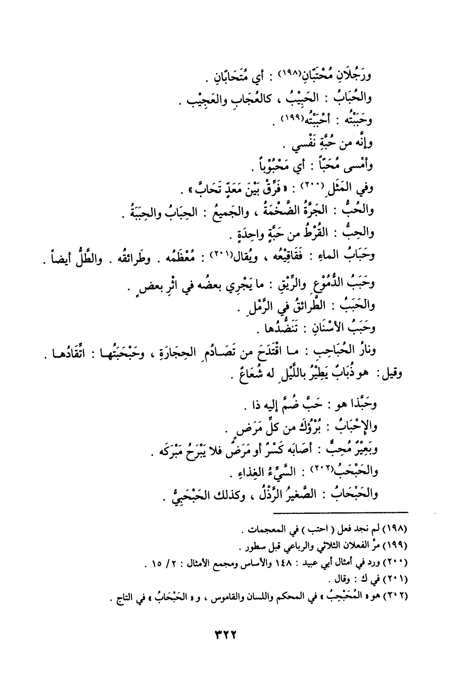 ورَجُلاَنِ مُحْتَبّانِ : أي مُتَحَابّانِ . والحُبَابُ : الحَبِيْبُ ، كالعُجَابِ والعَجِيْب . وحَبَبْتُه : أحْبَبْتُه . وإنَّه من حُبَّةِ نَفْسي . وأمْسى مُحَبّاً : أي مَحْبُوْباً . وفي المَثَلِ : فَرِّقْ بَيْنَ مَعَدٍّ تَحَابَّ . والحُبُّ : الجَرَّةُ الضَّخْمَةُ ، والجَميعُ : الحِبَابُ والحِبَبَةُ . والحِبُّ : القُرْطُ من حَبَّةٍ واحِدَةٍ . وحَبَابُ الماءِ : فَقَاقِيعُه ، ويُقال : مُعْظَمُه . وطَرائقُه . والطَّلُّ أيضاً . وحَبَبُ الدُّمُوْعِ والرِّيْقِ : ما يَجْرِي بعضُه في اثْرِ بعضٍ . والحَبَبُ : الطَّرائقُ في الرَّمْلِ . وحَبَبُ الأسْنَانِ : تَنَضُّدُها . ونارُ الحُبَاحِبِ : ما اقْتَدَحَ من تَصَادُمِ الحِجَارَةِ ، وحَبْحَبَتُها : اتِّقَادُها . وقيل : هو ذُبَابٌ يَطِيْرُ باللَّيلِ له شُعَاعٌ . وحَبَّذا هو : حَبَّ ضُمَّ إليه ذا . والإحْبَابُ : بُرْؤُكَ من كلِّ مَرَضٍ . وبَعِيْرٌ مُحِبٌّ : أصَابَه كَسْرٌ أو مَرَضٌ فلا يَبْرَحُ مَبْرَكَه . والحَبْحَبُ : السَّيِّيُ الغِذاءِ . والحَبْحَابُ : الصَّغيرُ الرَّذْلُ ، وكذلك الحَبْحَبِيُّ .