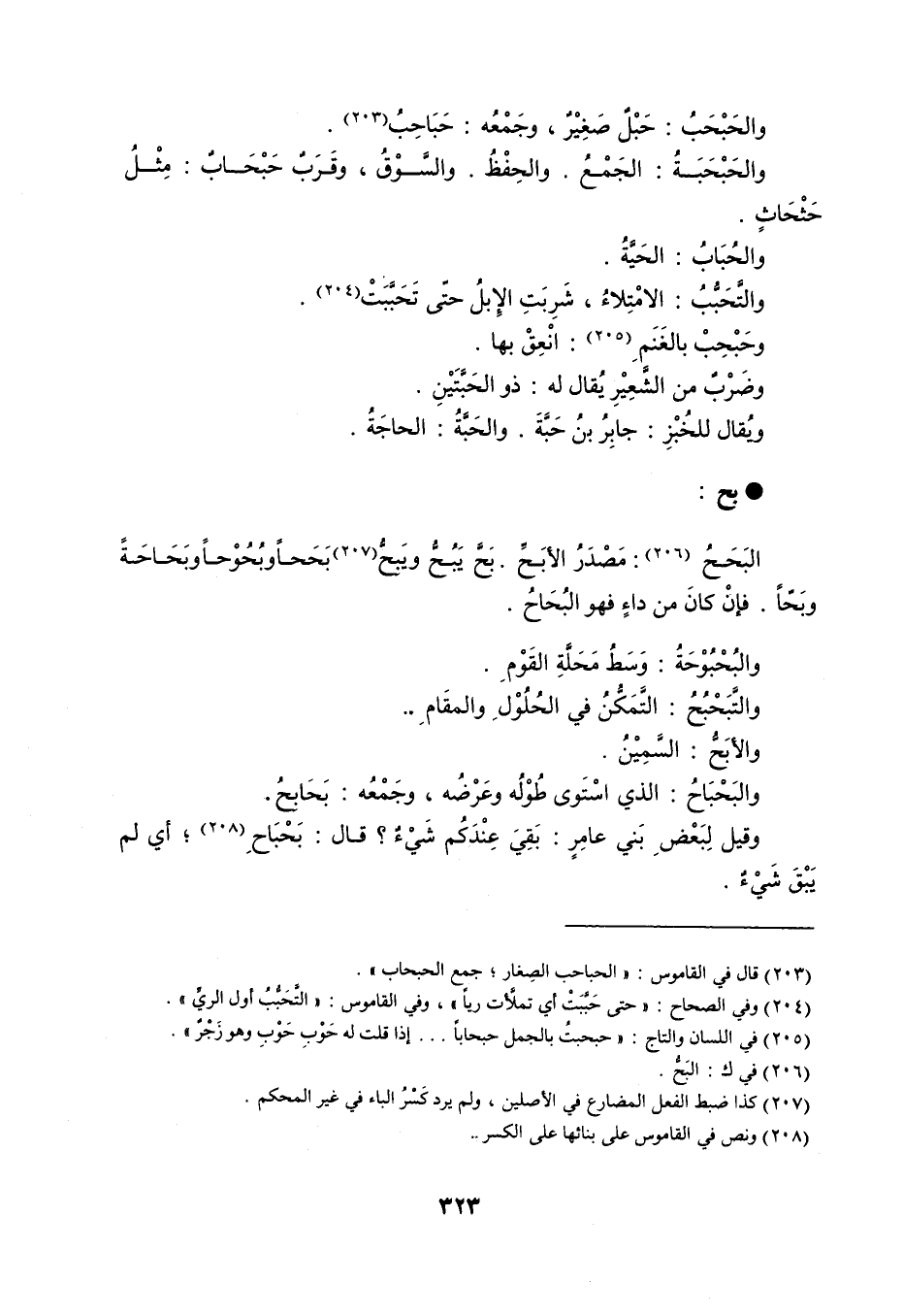 والحَبْحَبُ : حَبْلٌ صَغيْرٌ ، وجَمْعُه : حَبَاحِبُ . والحَبْحَبَةُ : الجَمْعُ . والحِفْظُ . والسَّوْقُ ، وقَرَبٌ حَبْحَابٌ : مِثْلُ حَثْحَاثٍ . والحُبَابُ : الحَيَّةُ . والتَّحَبُّبُ : الامْتلاءُ ، شَرِبَتِ الإِبلُ حتّى تَحَبَّبَتْ . وحَبْحِبْ بالغَنَمِ : انْعِقْ بها . وضَرْبٌ من الشَّعِيْرِ يُقال له : ذو الحَبَّتَيْنِ . ويُقال للخُبْزِ : جابِرُ بنُ حَيَّةَ . والحَبَّةُ : الحاجَةُ . ؟ ؟ بح البَحَحُ : مَصْدَرُ الأَبَحِّ ، بَحَّ يَبُحُّ ويَبحُّ بَحَحاً وبُحُوْحاً ، وبَحَاحةً وبَحّاً . فإنْ كانَ من داءٍ فهو البُحَاحُ . والبُحْبُوْحَةُ : وَسَطُ مَحَلَّةِ القَوْمِ . والتَّبَحْبُحُ : التَّمَكُّنُ في الحُلُوْلِ والمقَامِ . والأبَحُّ : السَّمِيْنُ . والبَحْبَاحُ : الذي اسْتَوى طُوْلُه وعَرْضُه ، وجَمْعُه : بَحَابحُ . وقيل لِبَعْضِ بَني عامِرٍ : بَقِيَ عِنْدَكُم شَيْءٌ ؟ قال : بَحْبَاحِ ، أي لم يَبْقَ شَيْءٌ .