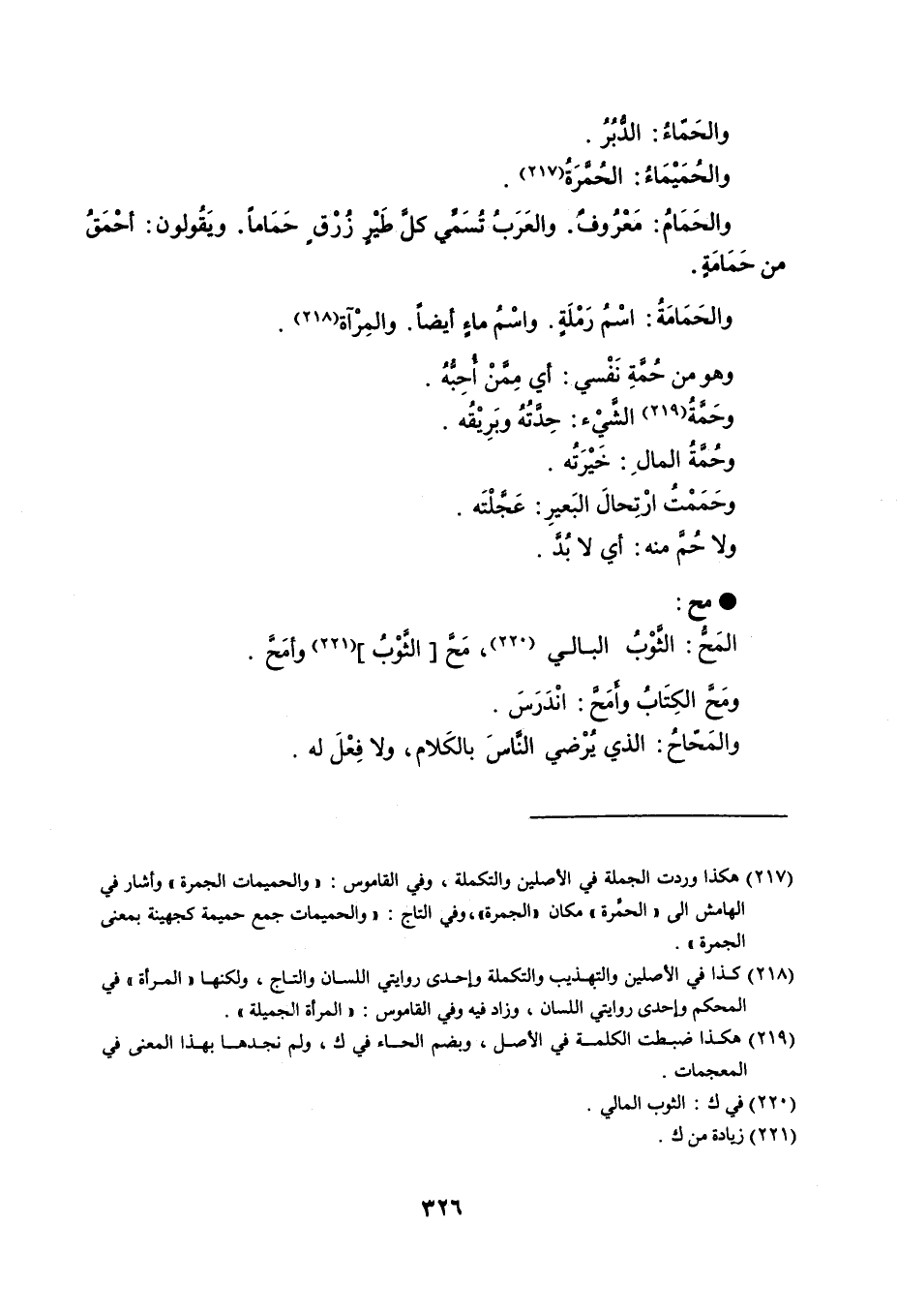 والحَمّاءُ : الدُّبُرُ . والحُمَيْمَاءُ : الحُمَّرَةُ . والحَمَامُ : مَعْرُوفٌ . والعَرَبُ تُسَمِّي كلَّ طَيْرٍ زُرْقٍ حَمَاماً . ويَقُولون : أحْمَقُ من حَمَامَةٍ . والحَمَامَةُ : اسْمُ رَمْلَةٍ . واسْمُ ماءٍ أيضاً . والمِرْآة . وهو من حُمَّةِ نَفْسي : أي مِمَّنْ أُحِبُّهُ . وحَمَّةُ الشَّيْء : حِدَّتُهُ وبَرِيْقُه . وحُمَّةُ المالِ : خَيْرَتُه . وحَمَمْتُ ارْتِحالَ البَعيرِ : عَجَّلْتَه . ولا حُمَّ منه : أي لا بُدَّ . مح المَحُّ : الثَّوْبُ البالي ، مَحَّ الثَّوْبُ وأمَحَّ . ومَحَّ الكِتَابُ وأَمَحَّ : انْدَرَسَ . والمَحّاحُ : الذي يُرْضي النَّاسَ بالكَلام ولا فِعْلَ له .