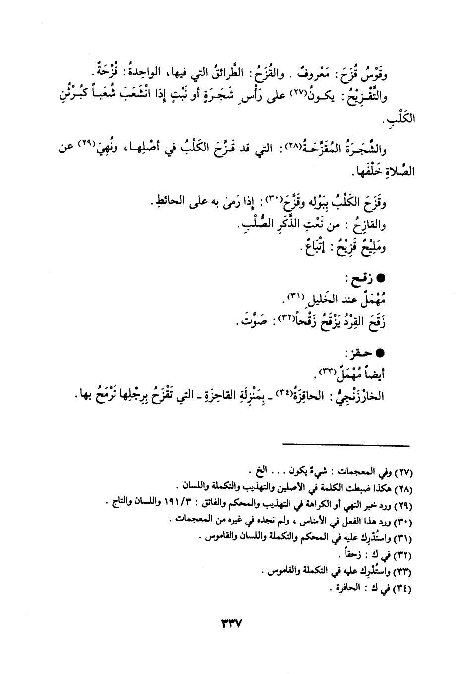 وقَوسُ قُزَحَ : مَعْروفٌ . والقُزَحُ : الطَّرائقُ التي فيها ، والواحِدة قُزْحَةٌ . والتَّقْزِيحُ : يكونُ على رأْسِ شَجَرَةٍ أو نَبْتٍ إذا انْشَعَبَ شُعَباً كبُرْثُنِ الكَلْبِ . والشَّجَرَةُ المُقَزَّحَةُ : التي قد قَزَّحَ الكَلْبُ في أصْلِها ، ونُهِيَ عن الصَّلاةِ خَلْفِها . وقَزَحَ الكَلْبُ بِبَوْلِه وقَزَّحَ : إذا رَمى به على الحائط . والقازِحُ : من نَعْتِ الذَكَرِ الصُّلْبِ . ومَلِيْحٌ قَزِيْحٌ : إتْبَاعٌ . زقح مُهْمَلٌ عند الخَليلِ . زَقَحَ القِرْدُ يَزْقَحُ زَقْحاً : صَوَّتَ . حقز : أيضاً مُهْمَلٌ . الخارْزَنْجِيُّ : الحاقِزَةُ - بِمَنْزِلَةِ القاحِزَةِ - التي تَقْزَحُ بِرِجْلِها تَرْمَحُ بها .
