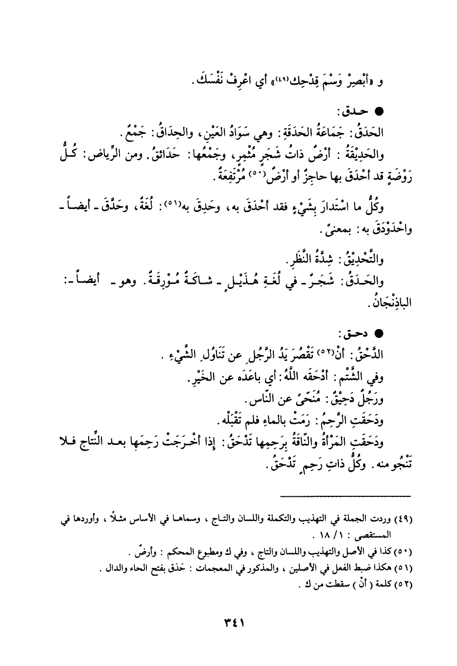 و أبْصِرْ وَسْمَ قِدْحِك أي اعْرِفْ نَفْسَكَ . حدق الحَدَقُ : جَمَاعَةُ الحَدَقَةِ وهي سَوَادُِ العَيْنِ ، والحِدَاقُ : جَمْعٌ . والحَديْقَةُ : أرْضٌ ذاتُ شجَرٍ مُثْمِرٍ ، وجَمْعُها : حَدَائقُ . ومن الرِّياض : كُلُّ رَوْضَةٍ قد أحْدَقَ بها حاجِزٌ أو أرْضٌ مُرْتَفِعَةٌ . وكُلُّ ما اسْتَدارَ بِشَيْءٍ فقد أحْدَقَ به ، وحَدِقَ به : لُغَةٌ ، وحَدَّقَ - أيضاً : واحْدَوْدَقَ به : بمعنىً . والتَّحْدِيقُ : شِدَّةُ النَّظَرِ . والحَدَقُ : شَجَرٌ - في لُغَةِ هُذَيْلٍ - شاكَةٌ مُوْرِقَةٌ . وهو - أيضاً - : الباذِنْجَانُ . دحق الدَّحْقُ : أنْ تَقْصُرَ يَدُ الرَّجُلِ عن تَنَاوُلِ الشَّيْءِ . وفي الشَّتْم : أدْحَقَه اللهُ : أي باعَدَه عن الخَيْر . ورَجُلٌ دَحِيقٌ : مُنَحّىً عن الناس . ودَحَقَتِ الرَّحِمُ : رَمَتْ بالماءِ فلم تَقْبَلْه . ودَحَقَتِ المَرْأةُ والنّاقَةُ بِرَحِمِها تَدْحَقُ : إذا أخْرَجَتْ رَحِمَها بعد النِّتاج فلا تَنْجُو منه . وكُلُّ ذاتِ رَحِمٍ تَدْحَقُ .