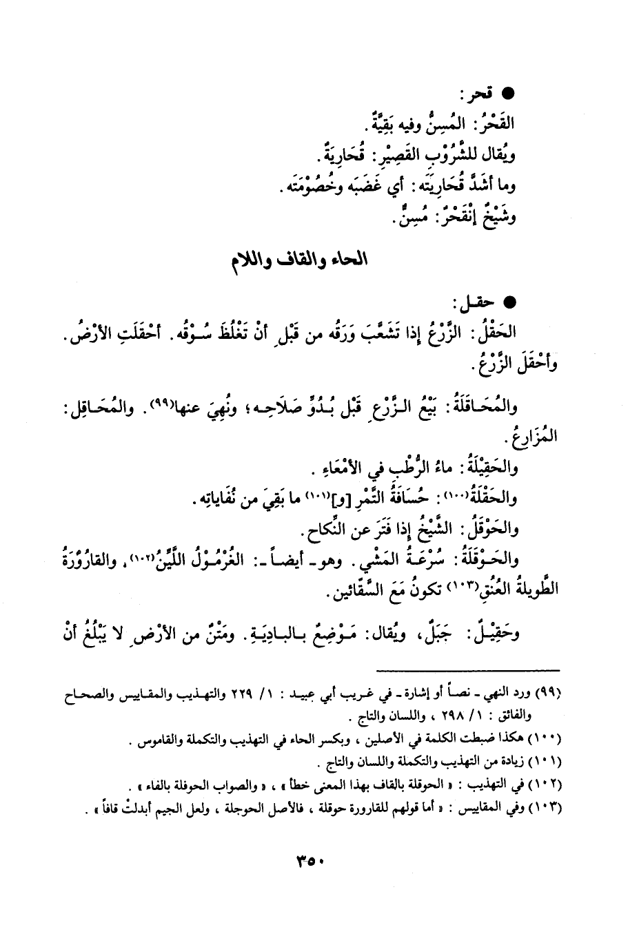 حقل الحَقْلُ : الزَّرْعُ إذا تَشَعَّبَ وَرَقُه من قَبْلِ أنْ تَغْلُظَ سُوْقُه . أحْقَلَتِ الارْضُ . وأحْقَلَ الزَّرْعُ . والمُحَاقَلَةُ : بَيْعُ الزَّرْعِ قَبْل بُدُوِّ صَلاَحِه ، ونُهِيَ عنها . والمُحَاقِل : المُزَارِعُ . والحَقِيْلَةُ : ماءُ الرُّطْبِ في الأمْعَاءِ . والحَقْلَةُ : حُسَافَةُ التَّمْرِ وما بَقِيَ من نُفَاياتِه . والحَوْقَلُ : الشَّيْخُ إذا فَتَرَ عن النِّكاح . والحَوْقَلَةُ : سُرْعَةُ المَشْي . وهو - أيضاً - : الغُرْمُوْلُ اللَّيِّنُ ، والقارُوْرَةُ الطَّويلةُ العُنُقِ تكونُ مَعَ السَّقّائين . وحَقِيْلٌ : جَبَلٌ ، ويُقال : مَوْضِعٌ بالبادِيَةِ . ومَتْنٌ من الأرْضِ لا يَبْلُغُ أنْ
