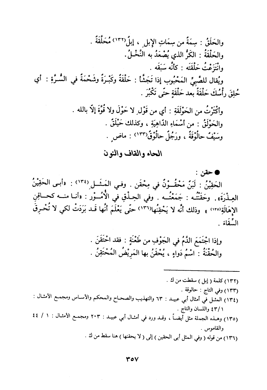 حقن : الحَقِيْنُ : لَبَنٌ مَحْقُوْنٌ في مِحْقَن . وفي المَثَلِ : أبى الحَقِيْنُ العِذْرَةَ . وحَقَنْتُه : جَمَعْتُه . وفي الحِذْقِ في الأُمُورْ : أنا منه كحاقِنِ الإِهَالَةِ وذلك أنَّه لا يَحْقِنُها حتّى يَعْلَمَ أنَّها قد بَرَدَتْ لكي لا تُحْرِقَ السِّقَاء . وإذا اجْتَمَعَ الدَّمُ في الجَوْفِ من طَعْنَةٍ : فقد احْتَقَنَ . والحُقْنَةُ : اسْمُ دَواءٍ ، يُحْقَنُ بها المَرِيْضُ المُحْتَقَنُ .