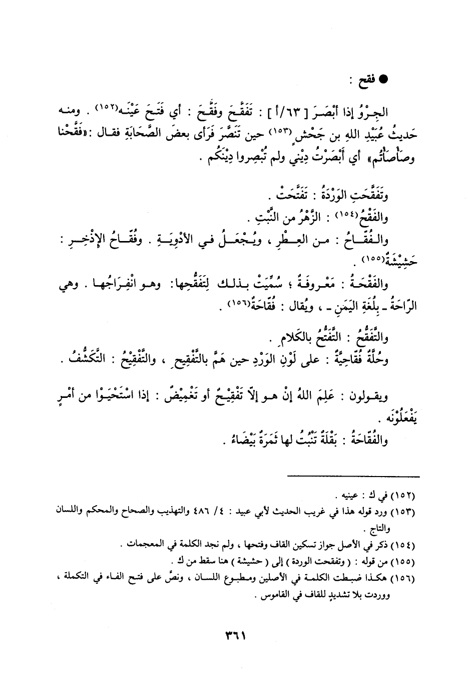 فقح : الجِرْوُ إذا أبْصَرَ : تَفَقَّحَ وفَقَّحَ : أي فَتَحَ عَيْنَه . ومنه حَديثُ عُبَيْدِ اللهِ بن جَحْشٍ حين تَنَصَّرَ فَرَأى بعضَ الصَّحَابَةِ فقال : فَقَّحْنا وصَأْصَأْتُم أي أَبْصَرْتُ دِيْني ولم تُبْصِروا ديْنَكُم . وتَفَقَّحَتِ الوَرْدَةُ : تَفَتَّحَتْ . والفَقْحُ : الزَّهْرُ من النَّبْتِ . والفُقّاحُ : من العَطْرِ ، ويُجْعَلُ في الأدْوِيَةِ . وفُقّاحُ الإِذْخِرِ : حَشِيشَةٌ . والفَقْحَةُ : مَعْروفَةٌ ، سُمِّيَتْ بذلك لِتَفَقُّحِها : وهو انْفِرَاجُها . وهي الرّاحَةُ - بِلُغَةِ اليَمَنِ - ، ويُقال : فٌقّاحَةٌ . والتَّفَقُّحُ : التَّفَتُّحُ بالكَلامِ . وحُلَّةٌ فُقّاحِيَّةٌ : على لَوْنِ الوَرْدِ حين هَمَّ بالتَّفْقِيحِ ، والتَّفْقِيْحُ : التَّكَشُّفُ . ويقولون : عَلِمَ اللهُ إنْ هو إلاّ تَفْقِيْحٌ أو تَغْمِيْضٌ : إذا اسْتَحْيَوْا من أمْرٍ يَفْعَلُوْنَه . والفُقّاحَةُ : بَقْلَةٌ تَنْبُتُ لها ثَمَرَةٌ بَيْضَاءُ .