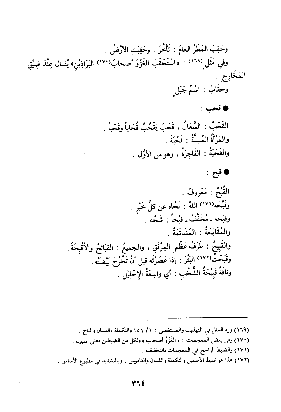 وحَقِبَ المَطَرُ العامَ : تَأَخَّرَ . وحَقِبَتِ الأرْضُ . وفي مَثَلٍ : اسْتَحْقَبَ الغَزْوَ أصحابُ البَرَاذِيْنِ يُقال عِنْدَ ضِيْقِ المَخَارِجِ . وحِقَابٌ : اسْمُ جَبَلٍ . قحب القَحْبُ : السُّعَالُ ، قَحَبَ يَقْحُبُ قُحَاباً وقَحْباً . والمَرْأَةُ المُسِنَّةُ : قَحْبَةٌ . والقَحْبَةُ : الفَاجِرةُ ، وهو من الأوَّل . قبح القُبْحُ : مَعْروفٌ . وقَبّحَه اللهُ : نَحَّاه عن كلِّ خَيرٍ . وقَبَحه - مُخَفَّفٌ - قَبْحاً : شَجَّه . والمُقَابَحَةُ : المُشَاتَمَةُ . والقَبِيحُ : طَرَفُ عَظْمِ المِرْفَقِ ، والجَميعُ : القَبَائحُ والأَقْبِحَةُ . وقَبَحْتُ البَثْرَ : إذا عَصَرْتَه قبل أنْ تَخْرُجَ بَيْضَتُه . وناقَةٌ قَبِيْحَةُ الشُّخْبِ : أي واسَعةُ الإِحْلِيْل .