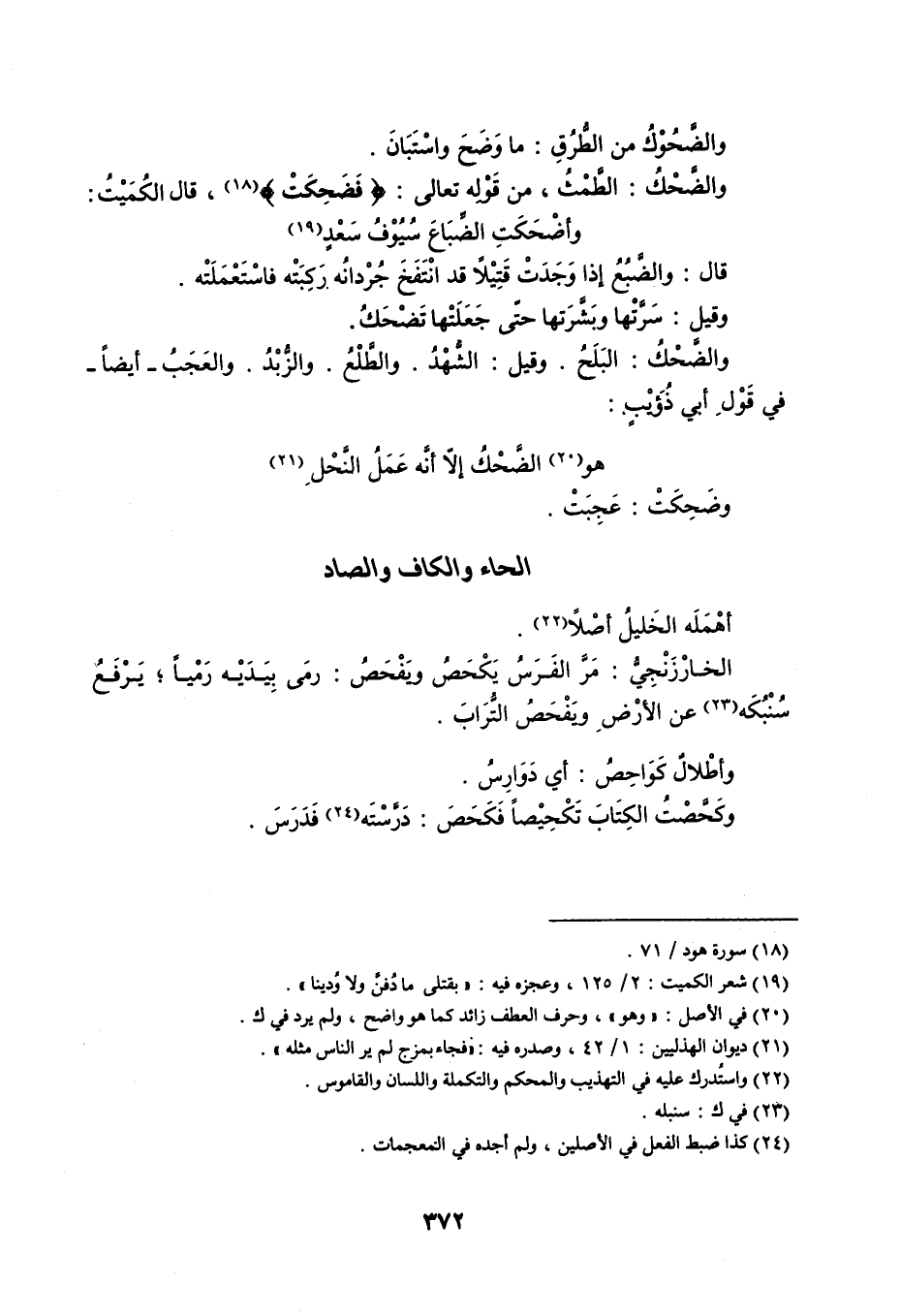 أهْمَلَه الخَليلُ أصْلاً . الخارْزَنْجِيُّ : مَرَّ الفَرَسُ يَكْحَصُ ويَفْحَصُ : رمى بِيَدَيْه رَمْياً ، يَرْفَعُ سُنْبُكَه عن الأرْضِ يَفْحَصُ التُّرَابَ . وأطْلالٌ كَوَاحِصُ : أي دَوَارِسُ . وكَحَّصْتُ الكِتَابَ تَكْحِيْصاً فَكَحَصَ : دَرَّسْتَه فَدَرَسَ .