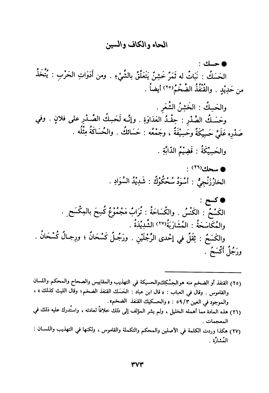 حسك الحَسَكُ : نَبَاتٌ له ثَمَرٌ خَشِنٌ يَتَعَلَّقُ بالشَّيْءِ . ومن أَدَوَاتِ الحَرْبِ : يُتَّخَذُ من حَدِيْدٍ . والقُنْفُدُ الضَّخْمُ أيضاً . والحَسِكُ : الخَشِنُ الشَّعَرِ . وحَسَكُ الصَّدْرِ : حِقْدُ العَدَاوَةِ . وإنَّه لَحَسِكُ الصَّدْرِ على فلانٍ . وفي صَدْرِه عَلَيَّ حَسِيْكَةٌ وحَسِيْفَةٌ ، وجَمْعُه : حَسَائكُ . والحُسَاكَةُ مِثْلُه . والحَسِيْكَةُ : قَضِيْمُ الدّابَّةِ . سحك الخارْزَنْجِيُّ : أسْوَدُ سُحْكُوْكٌ : شَدِيْدُ السَّوَادِ . كسح الكَسْحُ : الكَنْسُ . والكُسَاحَةُ : تُرَابٌ مَجْمُوْعٌ كُسِحَ بالمِكْسَحِ . والمُكَاسَحَةُ : المُشَارَبَةُ الشَّدِيدَةُ . والكَسَحُ : ثِقَلٌ في إحْدى الرِّجْلَيْنِ . ورَجُلٌ كَسْحَانٌ ، ورِجالٌ كُسْحَانُ . ورَجُلٌ أكْسَحُ .