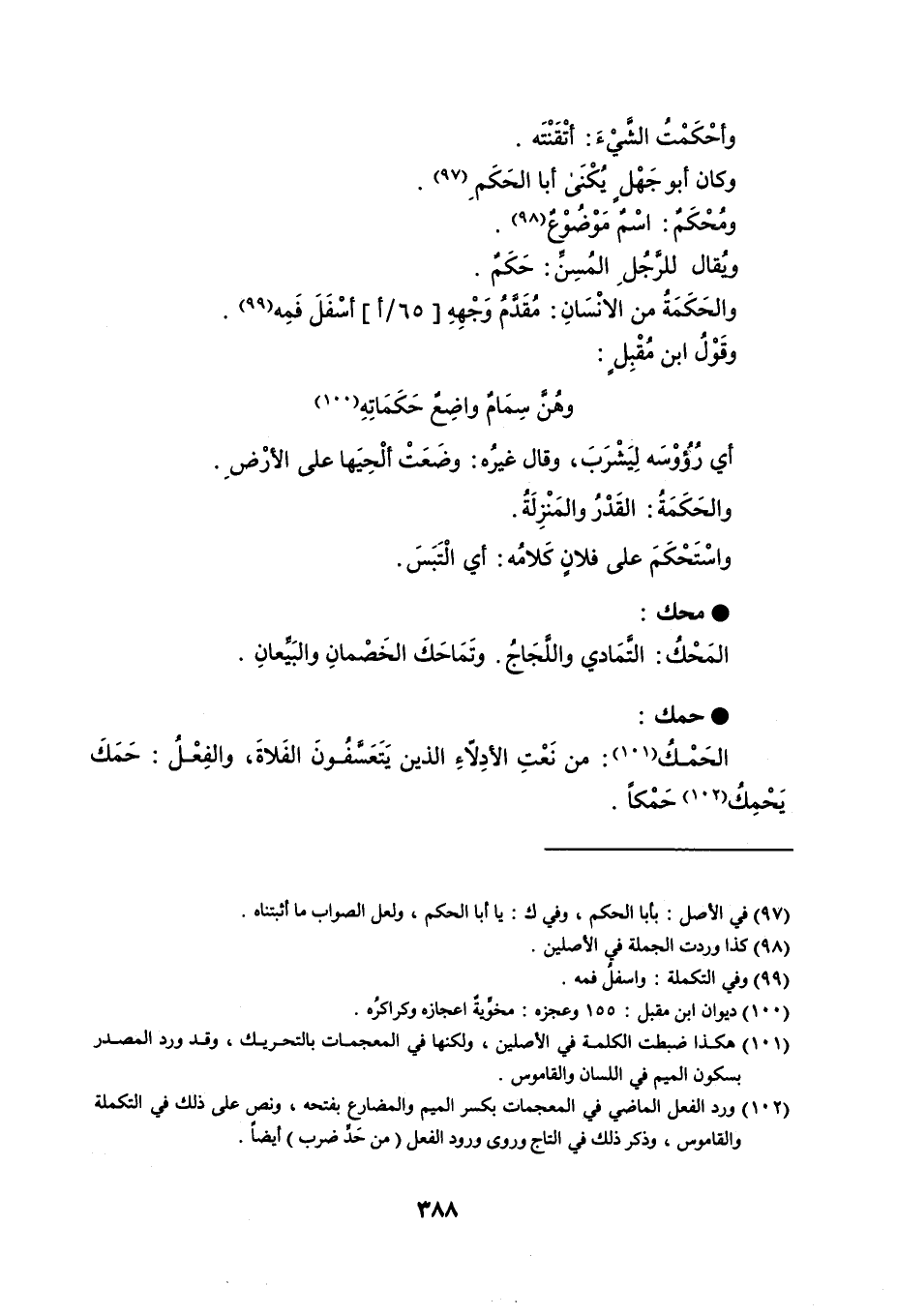وأحْكَمْتُ الشَّيْءَ : أتْقَنْتَه . وكان أبو جَهْلٍ يُكْنَى أبا الحَكَمِ . ومُحْكَمٌ : اسْمٌ مَوْضُوْعٌ . ويُقال للرَّجُلِ المُسِنِّ : حَكَمٌ . والحَكَمَةُ من الإنْسَانِ : مُقَدَّمُ وَجْهِهِ أسْفَلَ فَمِه . وقَوْلُ ابن مُقْبِلٍ : وهُنَّ سِمَامٌ واضِعٌ حَكَمَاتِهِ أي رُؤُوْسَه لِيَشْرَبَ ، وقال غيرُه : وضَعَتْ ألْحِيَها على الأرْضِ . والحَكَمَةُ : القَدْرُ والمَنْزِلَةُ . واسْتَحْكَمَ على فلانٍ كَلامُه : أي الْتَبَسَ . محك المَحْكُ : التَّمَادي واللَّجَاجُ . وتَمَاحَكَ الخَصْمانِ والبَيِّعانِ . حمك الحَمْكُ : من نَعْتِ الأدِلاّءِ الذين يَتَعَسَّفُونَ الفَلاةَ ، والفِعْلُ : حَمَكَ يَحْمِكُ حَمْكاً .