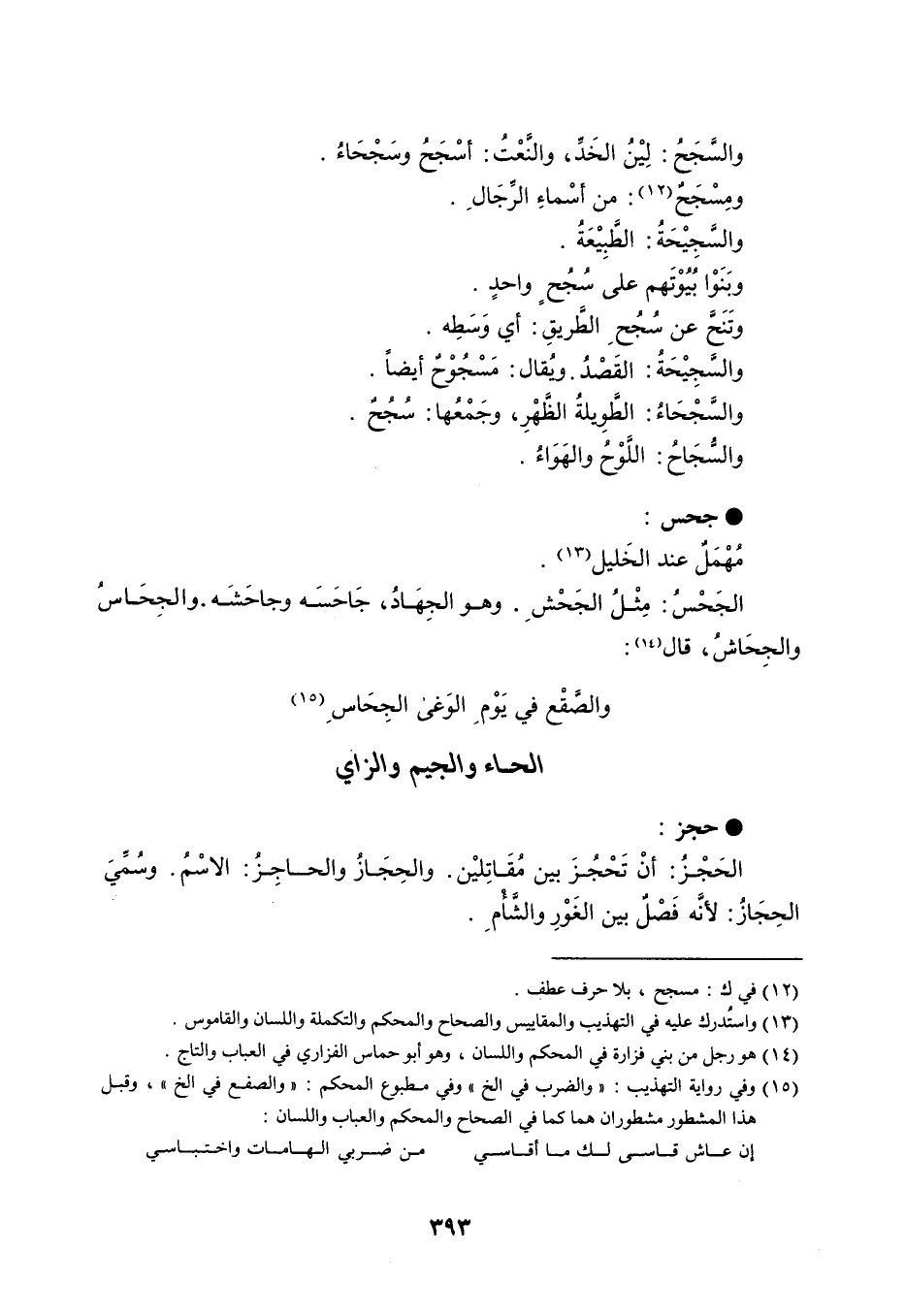 والسَّجَحُ : لِيْنُ الخَدِّ ، والنَّعْتُ : أسْجَحُ وسَجْحَاءُ . ومِسْجَحٌ : من أسْماءِ الرِّجَالِ . والسَّجِيْحَةُ : الطَّبِيْعَةُ . وبَنَوْا بُيُوْتَهم على سُجُحٍ واحدٍ . وتَنَحَّ عن سُجُحِ الطَّريقِ : أي وَسَطِه . والسَّجِيْحَةُ : القَصْدُ . ويُقال : مَسْجُوْحٌ أيضاً . والسَّجْحَاءُ : الطَّوِيلةُ الظَّهْرِ ، وجَمْعُها : سُجُحٌ . والسُّجَاحُ : اللَّوْحُ والهَوَاءُ . جحس مُهْمَلٌ عند الخَليل . الجَحْسُ : مِثْلُ الجَحْشِ . وهو الجِهَادُ ، جَاحَسَه وجاحَشَه . والجِحَاسُ والجِحَاشُ ، قال : والصَّقْع في يَوْمِ الوَغى الجِحَاسِ