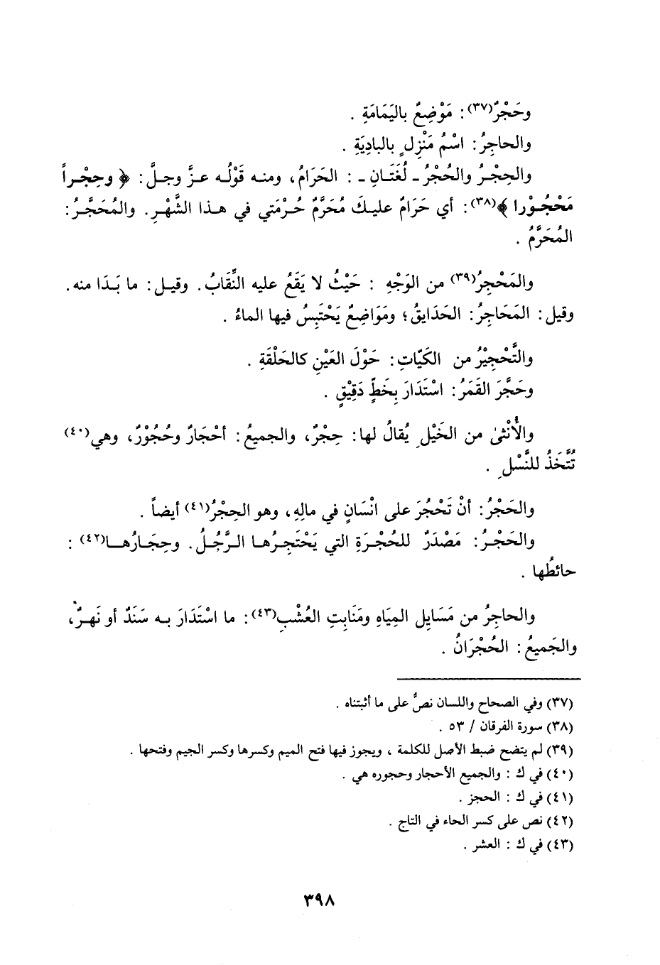 وحَجْرٌ : مَوْضِعٌ باليَمَامَةِ . والحاجِرُ : اسْمُ مَنْزِلٍ بالبادِيَةِ . والحِجْرُ والحُجْرٌ - لُغَتَانِ - : الحَرَامُ ، ومنه قَوْلُه عزَّ وجلَّ : ' وحِجْراً مَحْجُوْرا ' : أي حَرَامٌ عليكَ مُحَرَّمٌ حُرْمَتي في هذا الشَّهْرِ . والمُحَجَّرُ : المُحَرَّمُ . والمَحْجِرُ من الوَجْهِ : حَيْثُ لا يَقَعُ عليه النِّقَابُ . وقيل : ما بَدَا منه . وقيل : المَحَاجِرُ : الحَدَايقُ ، ومَوَاضِعٌ يَحْتَبِسُ فيها الماءُ . والتَّحْجِيْرُ من الكَيّاتِ : حَوْلَ العَيْنِ كالحَلْقَةِ . وحَجَّرَ القَمَرُ : اسْتَدَارَ بِخَطٍّ دَقِيْقٍ . والأُنْثى من الخَيْلِ يُقالُ لها : حِجْرٌ ، والجميعُ : أحْجَارٌ وحُجُوْرٌ ، وهي تُتَّخَذُ للنَّسْلِ . والحَجْرُ : أنْ تَحْجُرَ على انْسَانٍ في مالِهِ ، وهو الحِجْرُ أيضاً . والحَجْرُ : مَصْدَرٌ للحُجْرَةِ التي يَحْتَجِرُها الرَّجُلُ . وحِجَارُها : حائطُها . والحاجِرُ من مَسَايِل المِيَاهِ ومَنَابِتِ العُشْبِ : ما اسْتَدَارَ به سَنَدٌ أو نَهرٌ ، والجَميعُ : الحُجْرَانُ .