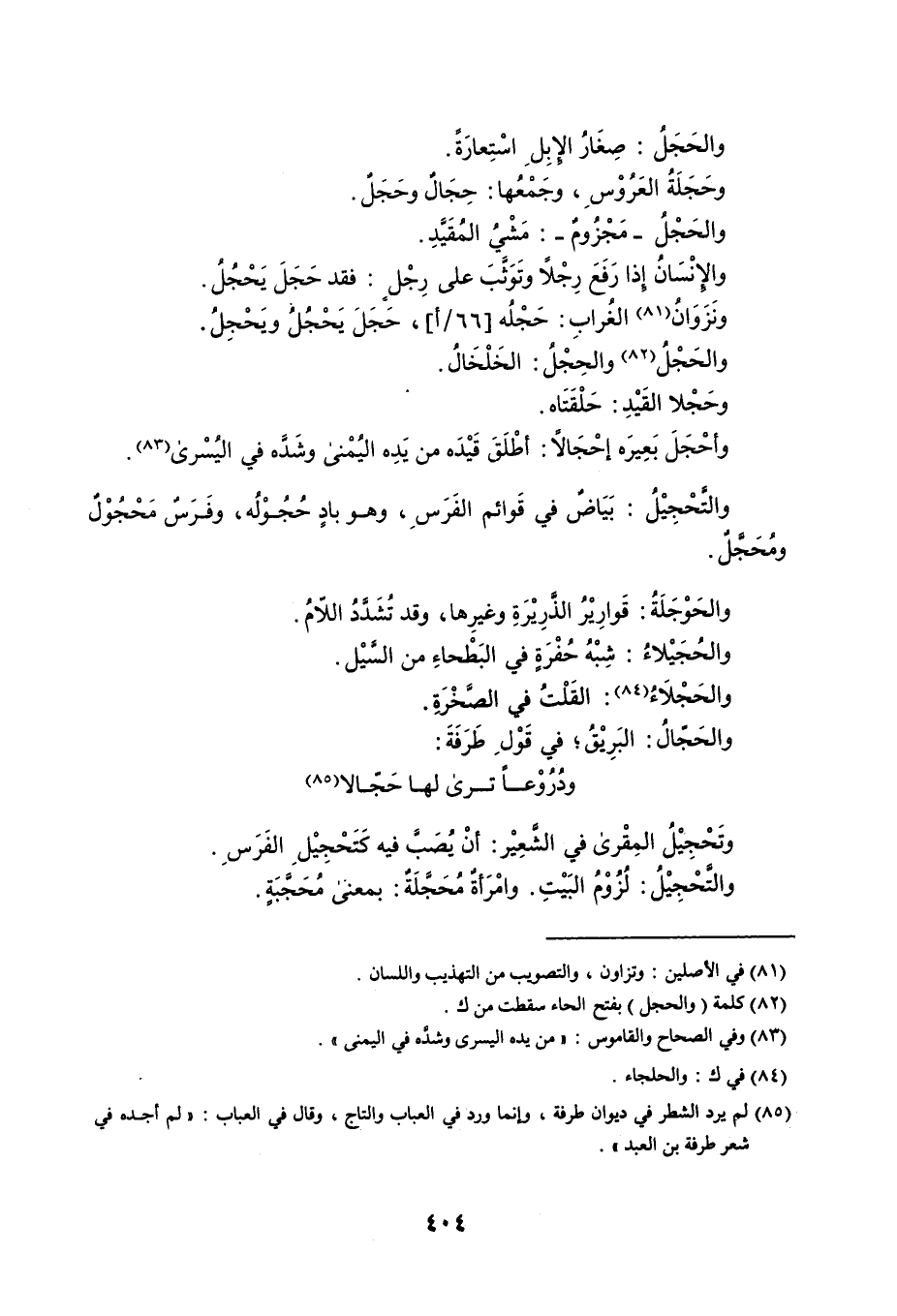 والحَجَلُ : صِغَارُ الإِبِلِ اسْتِعارَةً . وحَجَلَةُ العَرُوْسِ ، وجَمْعُها : حِجَالٌ وحَجَلٌ . والحَجْلُ - مَجْزُومٌ - : مَشْيُ المُقَيَّدِ . والإِنْسَانُ إِذا رَفَعَ رِجْلاً وتَوَثَّبَ على رِجْلٍ : فقد حَجَلَ يَحْجُلُ . ونَزَوَانُ الغُرابِ : حَجْلُه ، حَجَلَ يَحْجُلُ ويَحْجِلُ . والحَجْلُ والحِجْلُ : الخَلْخَالُ . وحَجْلا القَيْدِ : حَلْقَتَاه . وأحْجَلَ بَعِيرَه إحْجَالاً : أطْلَقَ قَيْدَه من يَدِه اليُمْنى وشَدَّه في اليُسْرى . والتَّحْجِيْلُ : بَيَاضٌ في قَوائم الفَرَسِ ، وهو بادٍ حُجُوْلُه ، وفَرَسٌ مَحْجُوْلٌ ومُحَجَّلٌ . والحَوْجَلَةُ : قَوارِيْرُ الذَّرِيْرَةِ وغيرِها ، وقد تُشَدَّدُ اللاّمُ . والحُجَيْلاءُ : شِبْهُ حُفْرَةٍ في البَطْحاءِ من السَّيْل . والحَجْلاءُ : القَلْتُ في الصَّخْرَةِ . والحَجّالُ : البَرِيْقُ ، في قَوْلِ طَرَفَةَ : ودُرُوْعاً ترى لها حَجّالا وتَحْجِيْلُ المِقْرى في الشَّعِيْر : أنْ يُصَبَّ فيه كَتَحْجِيْلِ الفَرَسِ . والتَّحْجِيْلُ : لُزُوْمُ البَيْتِ . وامْرَأةٌ مُحَجَّلَةٌ : بمعنى مُحَجَّبَةٍ .