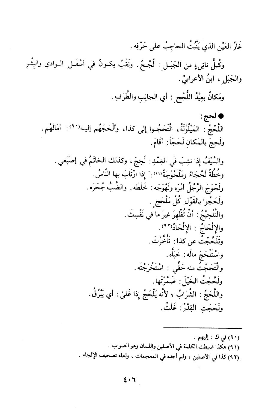 غَارُ العَيْن الذي يَنْبُتُ الحاجِبُ على حَرْفِه . وكُلُّ ناتِىءٍ من الجَبَلِ : لُجْحٌ . ونَقْبٌ يكونُ في أسْفلِ الوادي والبِئْرِ والجَبَلِ ، ابنُ الأعرابيِّ . ومَكانٌ بعِيْدُ اللُّجْحِ : أي الجانِبِ والطَّرَفِ . لحج اللَّحْجُ : المَيْلُوْلَةُ ، الْتَحَجُوا إلى كذا ، وألْحَجَهُم إليه : أمَالَهُم . ولَحِجَ بالمَكانِ لَحَجَاً : أقَامَ . والسَّيْفُ إِذا نشِبَ فَي الغِمْدِ : لَحِجَ ، وكذلك الخاتَمُ في إصبْعَي . وخُطَّةٌ لَحْجَاءُ ومَلْحُوْجَةٌ : إِذا ارْتَابَ بها النّاسُ . ولَحْوَجَ الرَّجُلُ أمْرَه ولَهْوَجَه : خَلَطَه . والضَّبُّ جُحْرَه . ولَحَجُوا بالقَوْلِ كُلَّ مَلْحَجٍ . والتَّلْحِيْجُ : أنْ تُظْهِرَ غيرَ ما في نَفْسِكَ . والإِلْحَاجُ : الإِلْحَادُ . وتَلَحَّجْتُ عن كذا : تَأَخَّرْتَ . واسْتَلْحَجَ مالَه : خَبَأَه . والْتَحَجْتُ منه حَقِّي : اسْتَخْرَجْتَه . ولَحَّجْتُ الخَيْلَ : ضَمَّرْتَها . واللَّحَجُ : الشَّرَابُ ، لأنَّه يَلْحَجُ إِذا غَلى : أي يَبْرُقُ . ولَحَجَتِ القِدْرُ : غَلَتْ .