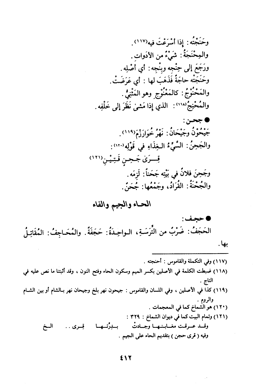 وحَنَجْتُه : إِذا أسْرَعْتَ فيه . والمِحْنَجَةُ : شَيْءٌ من الأدَواتِ . ورَجَعَ إلى حِنْجِه وبِنْجِه : أي أصْلِه . وحَنَجَتْه حاجَةٌ فَذَهَبَ لها : أي عَرَضَتْ . والمَحْنُوْجُ : كالمَعْنُوْجِ وهو المَثْنِيُّ . والمُحْنِجُ : الذي إِذا مَشى نَظَرَ إلى خَلْفِه . جحن جَيْحُوْنُ وجَيْحَانُ : نَهْرُ خُوَارَزْمَ . والجَحِنُ : السَّيِّءُ الغِذَاءِ في قَوْلِه : قِرَى جَحِنٍ قَتِيْنِ وجَحِنَ فلانٌ في بَيْتِه جَحَناً : لَزِمَه . والجُحْنَةُ : القُرَادُ ، وجَمْعُها : جُحَنٌ .