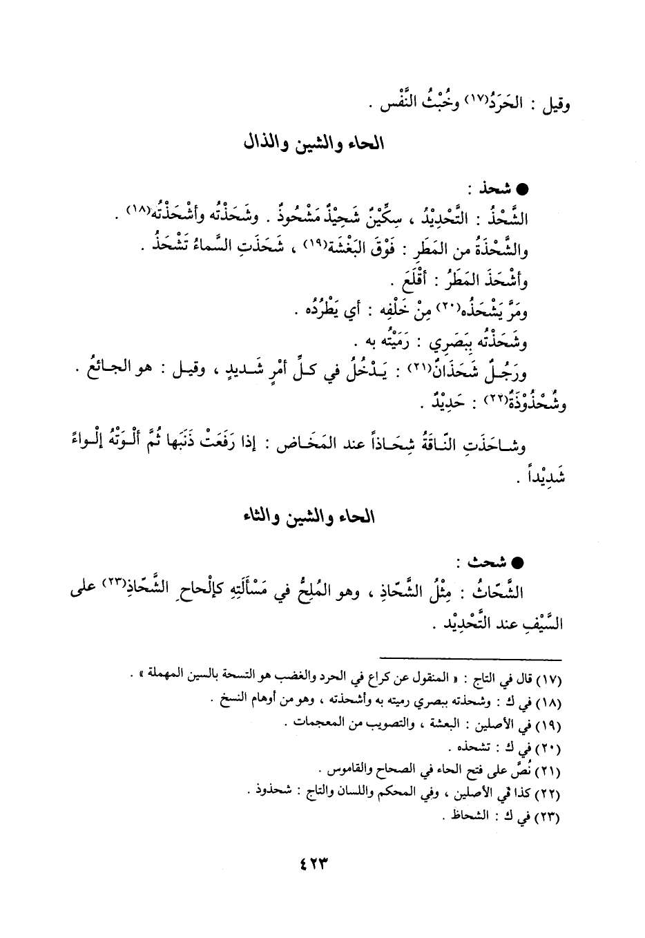 شحذ الشَّحْذُ : التَّحْدِيْدُ ، سِكِّيْنٌ شَحِيْذٌ مَشْحُوذٌ . وشَحَذْتُه وأشْحَذْتُه . والشَّحْذَةُ من المَطَرِ : فَوْقَ البَغْشَة ، شَحَذَتِ السَّماءُ تَشْحَذُ . وأشْحَذَ المَطَرُ : أقْلَعَ . ومَرَّ يَشْحَذُه مِنْ خَلْفِه : أي يَطْرُدُه . وشَحَذْتُه بِبَصَرِي : رَمَيْتُه به . ورَجُلٌ شَحَذَانٌ : يَدْخُلُ في كلِّ أمْرٍ شَديدٍ ، وقيل : هو الجائعُ . وشُحْذُوْذَةٌ : حَدِيْدٌ . وشاحَذَتِ النَاقَةُ شِحَاذاً عند المَخَاض : إذا رَفَعَتْ ذَنَبَها ثُمَّ ألْوَتْهُ إلْواءً شَدِيْداً .
