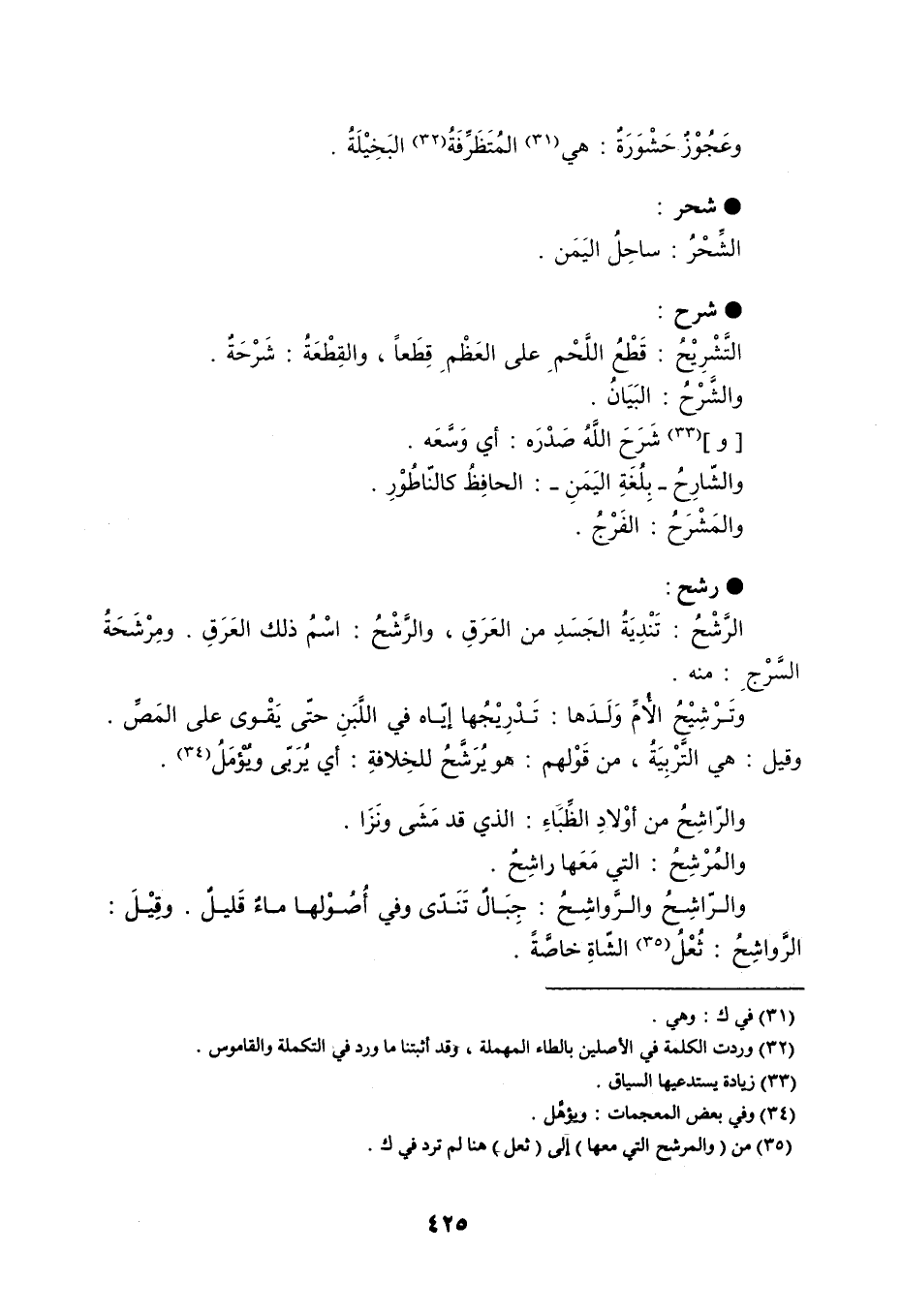 وعَجُوْزٌ حَشْوَرَةٌ : هي المُتَظَرِّفَةُ البَخِيْلَةُ . شحر الشِّحْرُ : ساحِلُ اليَمَن . شرح التَّشْرِيْحُ : قَطْعُ اللَّحْمِ على العَظْمِ قِطَعاً ، والقِطْعَةُ : شَرْحَةٌ . والشَّرْحُ : البَيَانُ . وشَرَحَ اللَّهُ صَدْرَه : أي وَسَّعَه . والشّارِحُ - بِلُغَةِ اليَمَنِ - : الحافِظُ كالنّاطُوْرِ . رشح الرَّشْحُ : تَنْدِيَةُ الجَسَدِ من العَرَقِ ، والرَّشْحُ : اسْمُ ذلك العَرَقِ . ومِرْشَحَةُ السَّرْجِ : منه . وتَرْشِيْحُ الأُمِّ وَلَدَها : تَدْرِيْجُها إيّاه في اللَّبَنِ حتّى يَقْوى على المَصِّ . وقيل : هي التَّرْبِيَةُ ، من قَوْلهم : هو يُرَشَّحُ للخِلافةِ : أي يُرَبّى ويُؤْمَلُ . والرّاشِحُ من أوْلادِ الظِّبَاءِ : الذي قد مَشَى ونَزَا . والمُرْشِحُ : التي مَعَها راشِحٌ . والرّاشِحُ والرَّواشِحُ : جَبَالٌ تَنَدّى وفي أُصُوْلها ماءٌ قَليلٌ . وقْيِلَ : الرَّواشِحُ : ثُعْلُ الشّاةِ خاصَّةً .