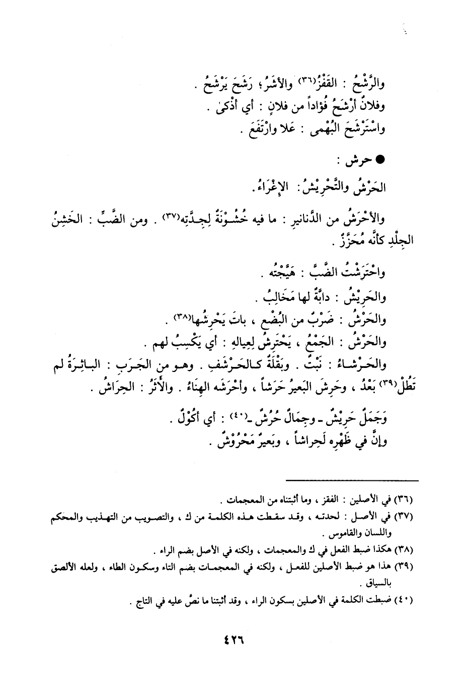 والرَّشْحُ : القَفْزُ والأشَرُ ، رَشَحَ يَرْشَحُ . وفلانٌ أرْشَحُ فُؤاداً من فلانٍ : أي أذْكى . واسْتَرْشَحَ البُهْمى : عَلا وارْتَفَعَ . حرش الحَرْشُ والتَّحْرِيْشُ : الإِغْراءُ . والأحْرَشُ من الدَّنانيرِ : ما فيه خُشُوْنَةٌ لِجِدَّتِه . ومن الضَّبِّ : الخَشِنُ الجِلْدِ كأنَّه مُحَزَّزٌ . واحْتَرَشْتُ الضَّبَّ : هَيَّجْتُه . والحَرِيْشُ : دابَّةٌ لها مَخَالِبُ . والحَرْشُ : ضَرْبٌ من البُضْع ، باتَ يَحْرِشُها . والحَرْشُ : الَجَمْعُ ، يَحْتَرِشُ لِعِيالهِ : أي يَكْسِبُ لهم . والحَرْشاءُ : نَبْتٌ . وبَقْلَةٌ كالحَرْشَفِ . وهو من الجَرَبِ : الباثِرَةُ لم تَطُلْ بَعْدُ ، وحَرِشَ البَعيرُ حَرَشاً ، وأحْرَشَه الهِنَاءُ . والأَثَرُ : الحِرَاشُ . وجَمَلٌ حَرِيْشٌ - وجِمَالٌ حُرُشٌ - : أي أكُوْلٌ . وإنَّ في ظَهْرِه لَحِراشاً ، وبَعيرٌ مَحْرُوْشٌ .