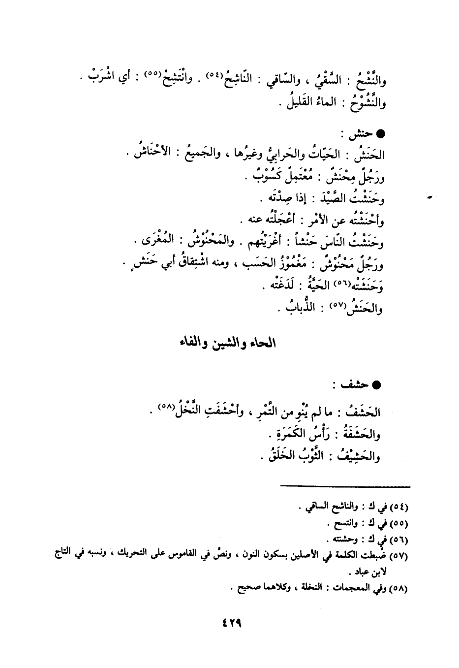 والنَّشْحُ : السَّقْيُ ، والسّاقي : النّاشِحُ . وانْتَشِحْ : أي اشْرَبْ . والنَّشُوْحُ : الماءُ القَليلُ . حنش الحَنَشُ : الحَيّاتُ والحَرابِيُّ وغيرُها ، والجَميعُ : الأحْنَاشُ . ورَجُلٌ مِحْنَشٌ : مُعْتَمِلٌ كَسُوْبٌ . وحَنَشْتُ الصَّيْدَ : إذا صِدْتَه . وأحْنَشْتُه عن الأمْر : أعْجَلْتُه عنه . وحَنَشْتُ النّاسَ حَنْشاً : أغْرَيْتُهم . والمَحْنُوْشُ : المُغْرَى . ورَجُلٌ مَحْنُوْشٌ : مَغْمُوْرُ الحَسَب ، ومنه اشْتِقاقُ أبي حَنَشٍ . وَحَنَشَتْه الحَيَّةُ : لَدَغَتْه . والحَنَشُ : الذُّبابُ .