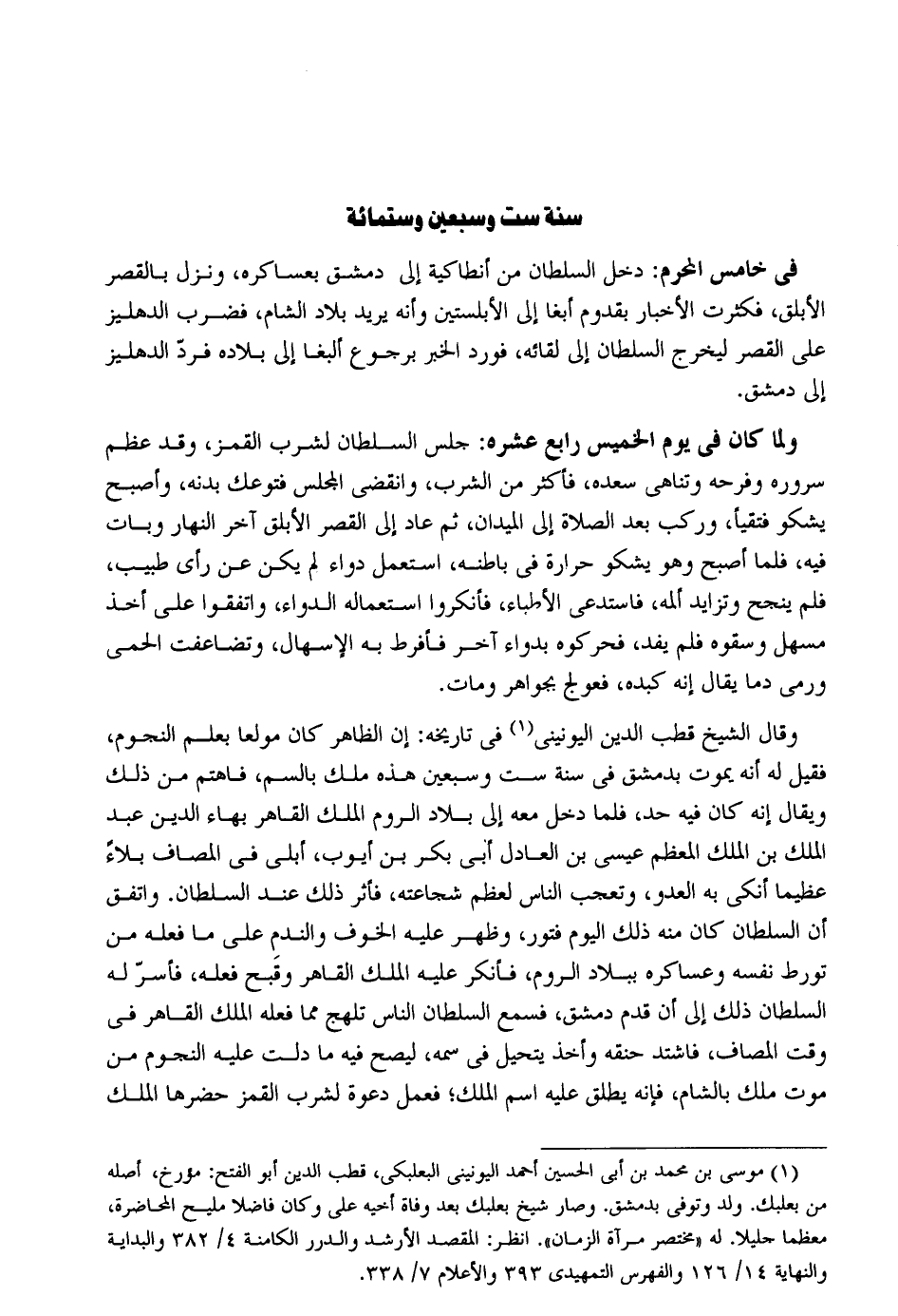 سنة سِتّ وَسبعين وسِتمِائَة فِي خَامِس الْمحرم: دخل السُّلْطَان من أنطاكية إِلَى دمشق بعساكره وَنزل بِالْقصرِ الأبلق فكثرت الْأَخْبَار بقدوم أبغا إِلَى الأبلستين وَأَنه يُرِيد بِلَاد الشَّام فَضرب الدهليز على الْقصر ليخرج السُّلْطَان إِلَى لِقَائِه فورد الْخَبَر بِرُجُوع ألبغا إِلَى بِلَاده فَرد الدهليز إِلَى دمشق. وَلما كَانَ فِي يَوْم الْخَمِيس رَابِع عشره: جلس السُّلْطَان لشرب القمز وَقد عظم سروره وفرحه وتناهي سعده فَأكْثر من الشّرْب وانقضي الْمجْلس فتوعك بدنه وَأصْبح يشكو فتقيأ وَركب بعد الصَّلَاة إِلَى الميدان ثمَّ عَاد إِلَى الْقصر الأبلق آخر النَّهَار وَبَات فِيهِ فَلَمَّا أصبح وَهُوَ يشكو حرارة فِي بَاطِنه اسْتعْمل دَوَاء لم يكن عَن رَأْي طَبِيب فَلم ينجح وتزايد ألمه فاستدعى الْأَطِبَّاء فانكروا اسْتِعْمَاله الدَّوَاء وَاتَّفَقُوا على أَخذ مسهل وسقوه فَلم يفد فحركوه بدواء آخر فأفرط بِهِ الإسهال وتضاعفت الحمي وَرمي دَمًا يُقَال إِنَّه كبده فعولج بجواهر وَمَات. وَقَالَ الشَّيْخ قطب الدّين اليونيني فِي تَارِيخه: إِن الظَّاهِر كَانَ مُولَعا بِعلم النُّجُوم فَقيل لَهُ أَنه يَمُوت بِدِمَشْق فِي سنة سِتّ وَسبعين هَذِه ملك بالسم فاهتم من ذَلِك وَيُقَال إِنَّه كَانَ فِيهِ حد فَلَمَّا دخل مَعَه إِلَى بِلَاد الرّوم الْملك القاهر بهاء الدّين عبد الْملك بن الْملك الْمُعظم عيسي بن الْعَادِل أبي بكر بن أَيُّوب أبلي فِي المصاف بلَاء عَظِيما أنكي بِهِ الْعَدو وتعجب النَّاس لعظم شجاعته فأثر ذَلِك عِنْد السُّلْطَان. وَاتفقَ أَن السُّلْطَان كَانَ مِنْهُ ذَلِك الْيَوْم فتور وَظهر عَلَيْهِ الْخَوْف والندم على مَا فعله من تورط نَفسه وعساكره بِبِلَاد الرّوم فَأنْكر عَلَيْهِ الْملك القاهر وقبح فعله فَأسر لَهُ السُّلْطَان ذَلِك إِلَى أَن قدم فِي دمشق فَسمع السُّلْطَان النَّاس تلهج مِمَّا فعله الْملك القاهر فِي وَقت المصاف فَاشْتَدَّ حنقه وَأخذ يتحيل فِي سمه ليَصِح فِيهِ مَا دلّت عَلَيْهِ النُّجُوم من موت ملك بِالشَّام فَإِنَّهُ يُطلق عَلَيْهِ اسْم الْملك فَعمل دَعْوَة لشرب القمز حضرها الْملك