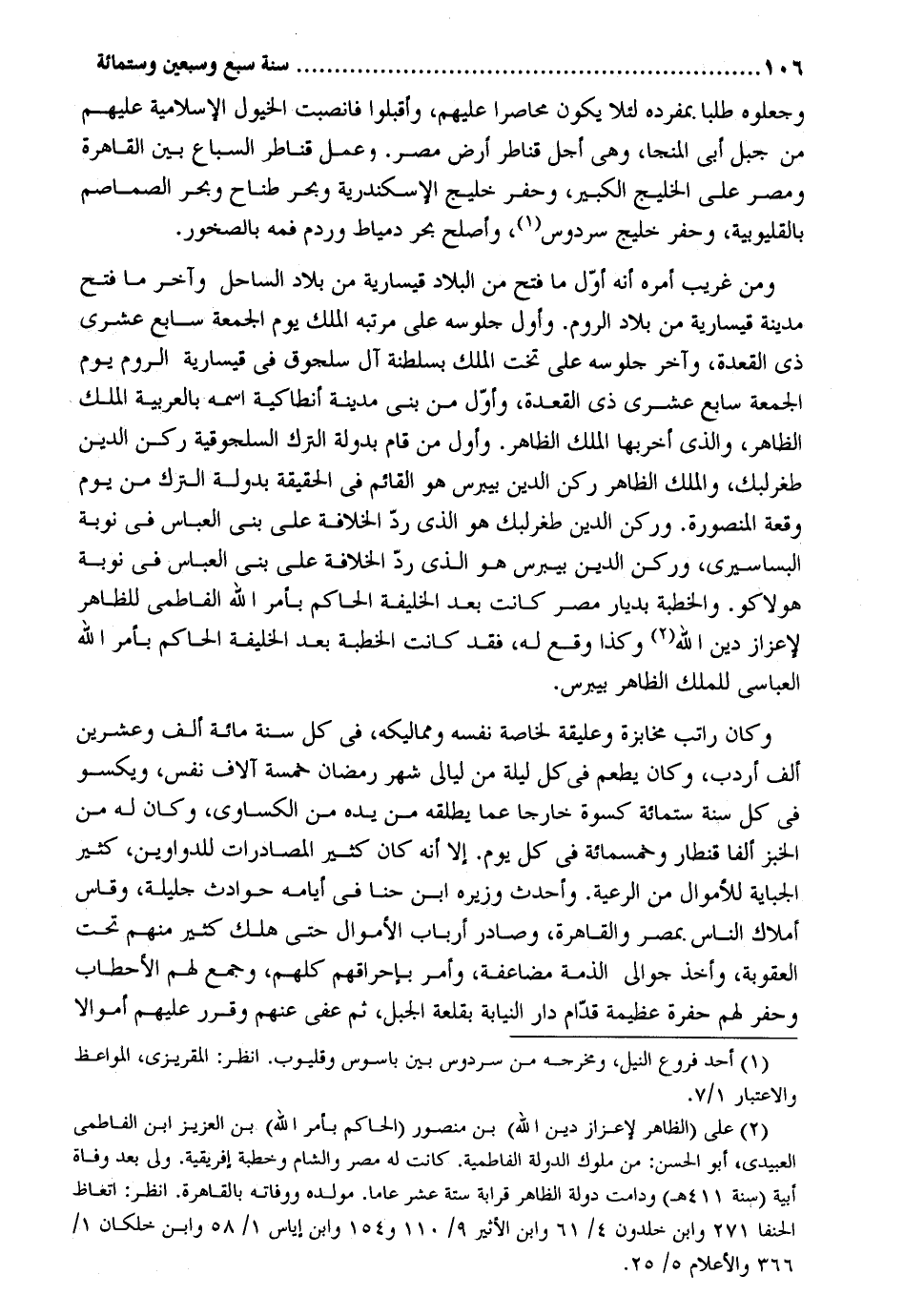 وجعلوه طلبا بمفرده لِئَلَّا يكون محاصرا عَلَيْهِم وَأَقْبلُوا فانصبت الْخُيُول الإسلامية عَلَيْهِم من جبل أبي المنجا وَهِي أجل قناطر أَرض مصر. وَعمل قناطر السبَاع بَين الْقَاهِرَة ومصر على الخليج الْكَبِير وحفر خليج الْإسْكَنْدَريَّة وبحر طناح وبحر الصماصم بالقليوبية وحفر خليج سردوس وَأصْلح بَحر دمياط وردم فَمه بالصخور. وَمن غَرِيب أمره إِنَّه أول مَا فتح من الْبِلَاد قيسارية من بِلَاد السَّاحِل وَآخر مَا فتح مَدِينَة قيسارية من بِلَاد الرّوم. وَأول جُلُوسه على مرتبه الْملك يَوْم الْجُمُعَة سَابِع عشري ذِي الْقعدَة وَآخر جُلُوسه على تخت الْملك بسلطنة آل سلجوق فِي قيسارية الرّوم يَوْم الْجُمُعَة سَابِع عشري ذِي الْقعدَة وَأول من بني مَدِينَة أنطاكية اسْمه بِالْعَرَبِيَّةِ الْملك الظَّاهِر وَالَّذِي أخربها الْملك الظَّاهِر. وَأول من قَامَ بدولة التّرْك السلجوقية ركن الدّين طغرلبك وَالْملك الظَّاهِر ركن الدّين بيبرس هُوَ الْقَائِم فِي الْحَقِيقَة بدولة التّرْك من يَوْم وقْعَة المنصورة. وركن الدّين طغرلبك هُوَ الَّذِي رد الْخلَافَة على بني الْعَبَّاس فِي نوبَة البساسيري وركن الدّين بيبرس هُوَ الَّذِي رد الْخلَافَة على بني الْعَبَّاس فِي نوبَة هولاكو. وَالْخطْبَة بديار مصر كَانَت بعد الْخَلِيفَة الْحَاكِم بِأَمْر الله الفاطمي للظَّاهِر لإعزاز دين الله وَكَذَا وَقع لَهُ فقد كَانَت الْخطْبَة بعد الْخَلِيفَة الْحَاكِم بِأَمْر الله العباسي للْملك الظَّاهِر بيبرس. وَكَانَ راتب مخابزة وعليقة لخاصة نَفسه ومماليكه فِي كل سنة مائَة ألف وَعشْرين ألف أردب وَكَانَ يطعم فِي كل لَيْلَة من ليَالِي شهر رَمَضَان خَمْسَة آلَاف نفس ويكسو فِي كل سنة سِتّمائَة كسْوَة خَارِجا عَمَّا يُطلقهُ من يَده من الكساوي وَكَانَ لَهُ من الْخبز ألفا قِنْطَار وَخَمْسمِائة فِي كل يَوْم. إِلَّا إِنَّه كَانَ كثير المصادرات للدواوين كثير الجباية للأموال من الرّعية. وأحدث وزيره ابْن حنا فِي أَيَّامه حوادث جليلة وقاس أَمْلَاك النَّاس بِمصْر والقاهرة وصادر أَرْبَاب الْأَمْوَال حَتَّى هلك كثير مِنْهُم تَحت الْعقُوبَة وَأخذ جوالي الذِّمَّة مضاعفة وَأمر بإحراقهم كلهم وَجمع لَهُم الأحطاب وحفر لَهُم حُفْرَة عَظِيمَة قُدَّام دَار النِّيَابَة بقلعة الْجَبَل ثمَّ عُفيَ عَنْهُم وَقرر عَلَيْهِم أَمْوَالًا