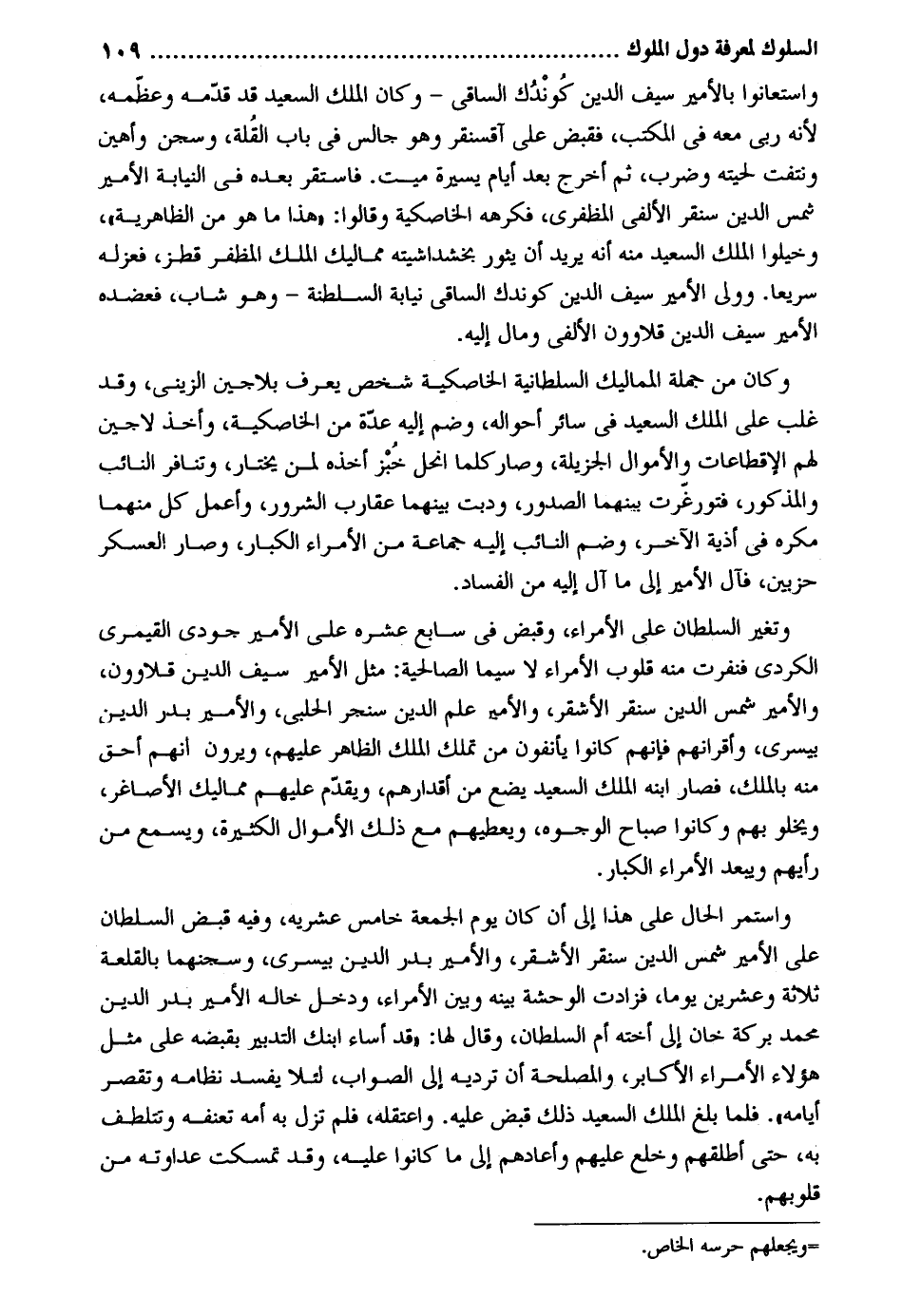واستعانوا بالأمير سيف الدّين كوندك الساقي. وَكَانَ الْملك السعيد. قد قدمه وعظمه لِأَنَّهُ رَبِّي مَعَه فِي الْمكتب فَقبض على آقسنقر وَهُوَ جَالس فِي بَاب الْقلَّة وسجن وأهين ونتفت لحيته وَضرب ثمَّ أخرج بعد أَيَّام يسيرَة ميت. فاستقر بعده فِي النِّيَابَة الْأَمِير شمس الدّين سنقر الألفي المظفري فكرهه الخاصكية وَقَالُوا. هَذَا مَا هُوَ من الظَّاهِرِيَّة وخيلوا الْملك السعيد مِنْهُ أَنه يُرِيد أَن يثور بخشداشيته مماليك الْملك المظفر قطز فَعَزله سَرِيعا. وَولي الْأَمِير سيف الدّين كوندك الساقي نِيَابَة السلطة وَهُوَ شَاب فعضده الْأَمِير سيف الدّين قلاوود الألفي وَمَال إِلَيْهِ. وَكَانَ من جملَة المماليك السُّلْطَانِيَّة الخاصكية شخص يعرف بلاجين الزيني وَقد غلب على الْملك السعيد فِي سَائِر أَحْوَاله وَضم إِلَيْهِ عدَّة من الخاصكية وَأخذ لاجين لَهُم الإقطاعات وَالْأَمْوَال الجزيلة وَصَارَ كلما انحل خبز أَخذه لمن يخْتَار وتنافر النَّائِب وَالْمَذْكُور فتورغرت بَينهمَا الصُّدُور ودبت بَينهمَا عقارب الشرور وأعمل كل مِنْهُمَا مكره فِي أذية الآخر وَضم النَّائِب إِلَيْهِ جمَاعَة من الْأُمَرَاء الْكِبَار وَصَارَ الْعَسْكَر حزبين فآل الْأَمِير إِلَى مَا آل إِلَيْهِ من وَتغَير السُّلْطَان على الْأُمَرَاء وَقبض فِي سَابِع عشره على الْأَمِير جودي القيمري الْكرْدِي فنفرت مِنْهُ قُلُوب الْأُمَرَاء لَا سِيمَا الصالحية: مثل الْأَمِير سيف الدّين قلاوون والأمير شمس الدّين سنقر الْأَشْقَر والأمير علم الدّين سنجر الْحلَبِي والأمير بدر الدّين بيسري وأقرانهم فَإِنَّهُم كَانُوا يأنفون من تملك الْملك الظَّاهِر عَلَيْهِم ويرون أَنهم أَحَق مِنْهُ بِالْملكِ فَصَارَ ابْنه الْملك السعيد يضع من أقدارهم وَيقدم عَلَيْهِم مماليك الأصاغر ويخلو بهم وَكَانُوا صباح الْوُجُوه ويعطهم مَعَ ذَلِك الْأَمْوَال الْكَثِيرَة وَيسمع من رَأْيهمْ وَيبعد الْأُمَرَاء الْكِبَار. وَاسْتمرّ الْحَال على هَذَا إِلَى أَن كَانَ يَوْم الْجُمُعَة خَامِس عشريه وَفِيه قبض السُّلْطَان على الْأَمِير شمس الدّين سنقر الْأَشْقَر والأمير بدر الدّين بيسري وسجنهما بالقلعة ثَلَاثَة وَعشْرين يَوْمًا فزادت الوحشة بَينه وَبَين الْأُمَرَاء وَدخل خَاله الْأَمِير بدر الدّين مُحَمَّد بركَة خَان إِلَى أُخْته أم السُّلْطَان وَقَالَ لَهَا: قد أَسَاءَ ابْنك التَّدْبِير بِقَبْضِهِ على مثل هَؤُلَاءِ الْأُمَرَاء الأكابر والمصلحة أَن ترديه إِلَى الصَّوَاب لِئَلَّا يفْسد نظامه وتقصر أَيَّامه. فَلَمَّا بلغ الْملك السعيد ذَلِك قبض عَلَيْهِ. واعتقله فَلم تزل بِهِ أمه تعنفه وتتلطف بِهِ حَتَّى أطلقهُم وخلع عَلَيْهِم وأعادهم إِلَى مَا كَانُوا عَلَيْهِ وَقد تمسكت عداوته من قُلُوبهم.