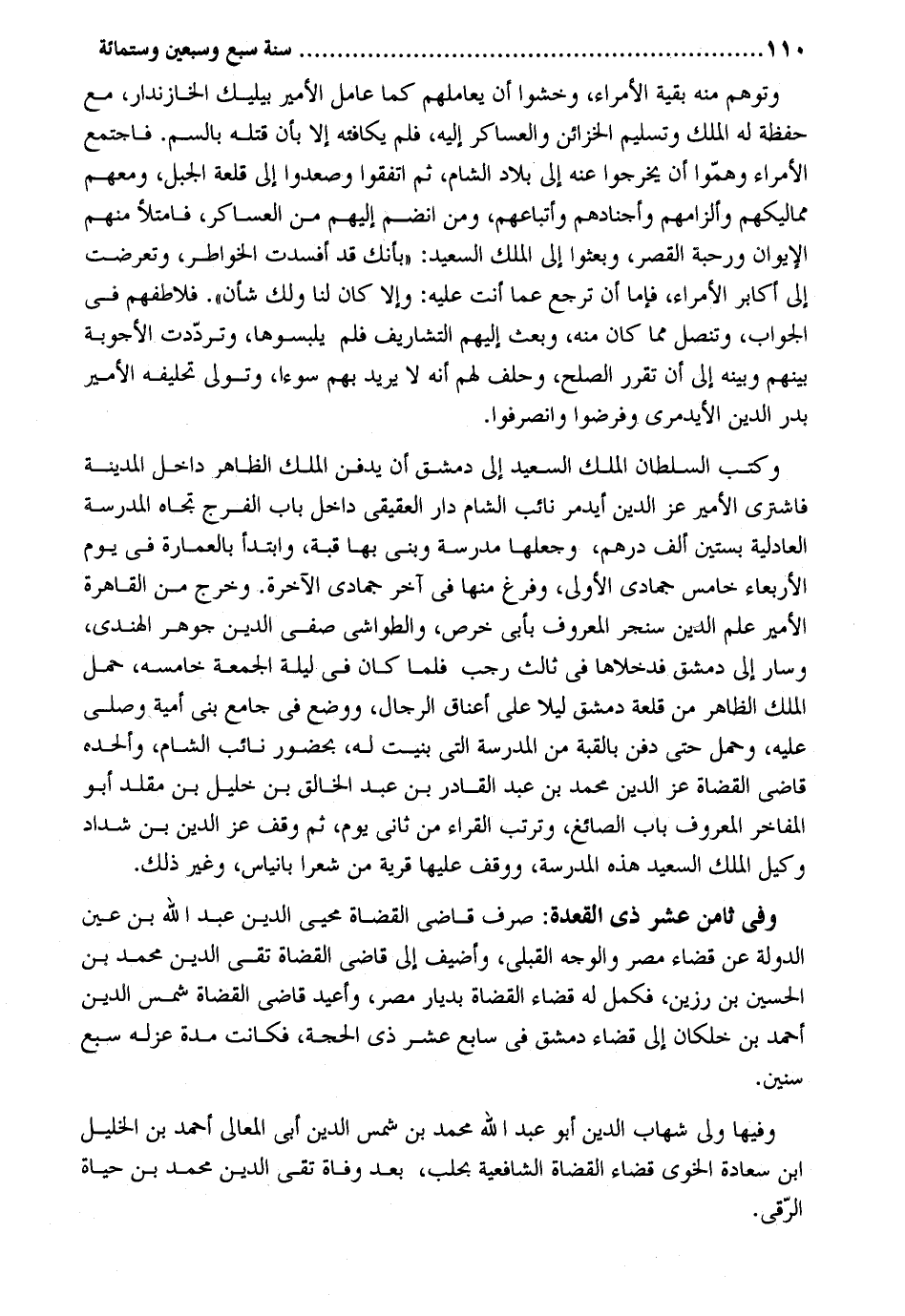 وتوهم مِنْهُ بَقِيَّة الْأُمَرَاء وخشوا أَن يعاملهم كَمَا عَامل الْأَمِير بيليك الخازندار مَعَ حفظَة لَهُ الْملك وَتَسْلِيم الخزائن والعساكر إِلَيْهِ فَلم يُكَافِئهُ إِلَّا بِأَن قَتله بالسم. فَاجْتمع الْأُمَرَاء وهموا أَن يخرجُوا عَنهُ إِلَى بِلَاد الشَّام ثمَّ اتَّفقُوا وصعدوا إِلَى قلعة الْجَبَل وَمَعَهُمْ مماليكهم وألزامهم وأجنادهم وأتباعهم وَمن انْضَمَّ إِلَيْهِم من العساكر فَامْتَلَأَ مِنْهُم الإيوان ورحبة الْقصر وبعثوا إِلَى الْملك السعيد: بأنك قد أفسدت الخواطر وتعرضت إِلَى أكَابِر الْأُمَرَاء فإمَّا أَن ترجع عَمَّا أَنْت عَلَيْهِ: وَإِلَّا كَانَ لنا وَلَك شان. فلاطفهم فِي الْجَواب وتنصل مِمَّا كَانَ مِنْهُ وَبعث إِلَيْهِم التشاريف فَلم يلبسوها وترددت الْأَجْوِبَة بَينهم وَبَينه إِلَى أَن تقرر الصُّلْح وَحلف لَهُم إِنَّه لَا يُرِيد بهم سوءا وتولي تَحْلِيفه الْأَمِير بدر الدّين الأيدمري وفرضوا وَانْصَرفُوا. وَكتب السُّلْطَان الْملك السعيد إِلَى دمشق أَن يدْفن الْملك الظَّاهِر دَاخل الْمَدِينَة فاشتري الْأَمِير عز الدّين أيدمر نَائِب الشَّام دَار العقيقي دَاخل بَاب الْفرج تجاه الْمدرسَة العادلية بستين ألف دِرْهَم وَجعلهَا مدرسة وَبني بهَا قبَّة وابتدأ بالعمارة فِي يَوْم الْأَرْبَعَاء خَامِس جُمَادَى الأولى وَفرغ مِنْهَا فِي آخر جُمَادَى الْآخِرَة. وَخرج من الْقَاهِرَة الْأَمِير علم الدّين سنجر الْمَعْرُوف بِأبي خرص والطواشي صفي الدّين جَوْهَر الْهِنْدِيّ وَسَار إِلَى دمشق فدخلاها فِي ثَالِث رَجَب فَلَمَّا كَانَ فِي لَيْلَة الْجُمُعَة خامسه حمل الْملك الظَّاهِر من قلعة دمشق لَيْلًا على أَعْنَاق الرِّجَال وَوضع فِي جَامع بني أُميَّة وَصلي عَلَيْهِ وَحمل حَتَّى دفن بالقبة من الْمدرسَة الَّتِي بنيت لَهُ بِحُضُور نَائِب الشَّام وألحده قَاضِي الْقُضَاة عز الدّين مُحَمَّد بن عبد الْقَادِر بن عبد الْخَالِق بن خَلِيل بن مقلد أَبُو المفاخر الْمَعْرُوف بَاب الصَّائِغ وترتب الْقُرَّاء من ثَانِي يَوْم ثمَّ وقف عز الدّين بن شَدَّاد وَكيل الْملك السعيد هَذِه الْمدرسَة ووقف عَلَيْهَا قَرْيَة من شعرًا بانياس وَغير ذَلِك. وَفِي ثامن عشر ذِي الْقعدَة: صرف قَاضِي الْقُضَاة محيي الدّين عبد الله بن عين الدولة عَن قَضَاء مصر وَالْوَجْه القبلي وأضيف إِلَى قَاضِي الْقُضَاة تَقِيّ الدّين مُحَمَّد بن الْحُسَيْن بن رزين فكمل لَهُ قَضَاء الْقُضَاة بديار مصر وأعيد قَاضِي الْقُضَاة شمس الدّين أَحْمد بن خلكان إِلَى قَضَاء دمشق فِي سَابِع عشر ذِي الْحجَّة فَكَانَت مُدَّة عَزله سبع سِنِين. وفيهَا ولي شهَاب الدّين أَبُو عبد الله مُحَمَّد بن شمس الدّين أبي الْمَعَالِي أَحْمد بن الْخَلِيل ابْن سَعَادَة الخوي قَضَاء الْقُضَاة الشَّافِعِيَّة بحلب بعد وَفَاة تَقِيّ الدّين مُحَمَّد بن حَيَاة الرقي.