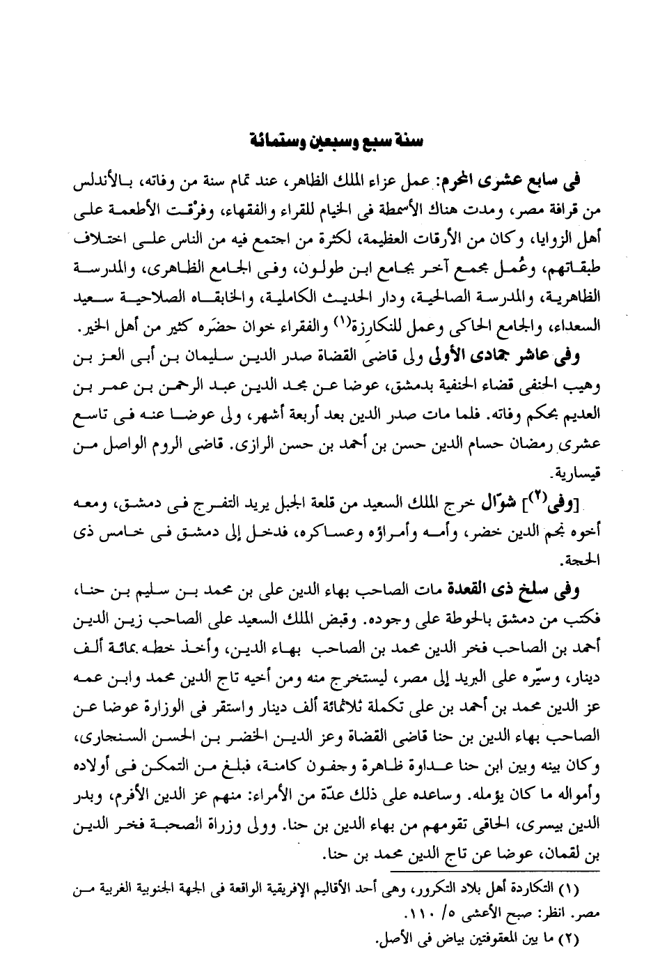 سنة سبع وَسبعين وسِتمِائَة فِي سَابِع عشري الْمحرم: عمل عزاء الْملك الظَّاهِر عِنْد تَمام سنة من وَفَاته بالأندلس من قرافة مصر ومدت هُنَاكَ الأسمطة فِي الْخيام للقراء وَالْفُقَهَاء وَفرقت الْأَطْعِمَة على أهل الزوايا وَكَانَ من الأرقات الْعَظِيمَة لِكَثْرَة من اجْتمع فِيهِ من النَّاس على اخْتِلَاف طبقاتهم وَعمل مجمع آخر بِجَامِع ابْن طولون وَفِي الْجَامِع الظَّاهِرِيّ والمدرسة الظَّاهِرِيَّة والمدرسة الصالحية وَدَار الحَدِيث الكاملية والخابقاه الصلاحية سعيد السُّعَدَاء وَالْجَامِع الحاكي وَعمل للنكارزة والفقراء خوان حَضَره كثير من أهل الْخَيْر. وَفِي عَاشر جُمَادَى الأولى ولي قَاضِي الْقُضَاة صدر الدّين سُلَيْمَان بن أبي الْعِزّ بن وهيب الْحَنَفِيّ قَضَاء الْحَنَفِيَّة بِدِمَشْق عوضا عَن مجد الدّين عبد الرَّحْمَن بن عمر بن العديم بِحكم وَفَاته. فَلَمَّا مَاتَ صدر الدّين بعد أَرْبَعَة أشهر ولي عوضا عَنهُ فِي تَاسِع عشري رَمَضَان حسام الدّين حسن بن أَحْمد بن حسن الرَّازِيّ. قَاضِي الرّوم الْوَاصِل من قيسارية. وَفِي شَوَّال خرج الْملك السعيد من قلعة الْجَبَل يُرِيد التفرج فِي دمشق وَمَعَهُ أَخُوهُ نجم الدّين خضر وَأمه وأمراؤه وعساكره فَدخل إِلَى دمشق فِي خَامِس ذِي الْحجَّة. وَفِي سلخ ذِي الْقعدَة مَاتَ الصاحب بهاء الدّين على بن مُحَمَّد بن سليم بن حنا فَكتب من دمشق بالحوطة على وجوده. وَقبض الْملك السعيد على الصاحب زين الدّين أَحْمد بن الصاحب فَخر الدّين مُحَمَّد بن الصاحب بهاء الدّين وَأخذ خطه بِمِائَة ألف دِينَار وسيره على الْبَرِيد إِلَى مصر ليستخرج مِنْهُ وَمن أَخِيه تَاج الدّين مُحَمَّد وَابْن عَمه عز الدّين مُحَمَّد بن أَحْمد بن على تَكْمِلَة ثَلَاثمِائَة ألف دِينَار وَاسْتقر فِي الوزارة عوضا عَن الصاحب بهاء الدّين بن حنا قَاضِي الْقُضَاة وَعز الدّين الْخضر بن الْحسن السنجاري وَكَانَ بَينه وَبَين ابْن حنا عَدَاوَة ظَاهِرَة وجفون كامنة فَبلغ من التَّمَكُّن فِي أَوْلَاده وأمواله مَا كَانَ يؤمله. وساعده على ذَلِك عدَّة من الْأُمَرَاء: مِنْهُم عز الدّين الأفرم وَبدر الدّين بيسري الحاقي تقومهم من بهاء الدّين بن حنا. وَولي وزراة الصُّحْبَة فَخر الدّين بن لُقْمَان عوضا عَن تَاج الدّين مُحَمَّد بن حنا.