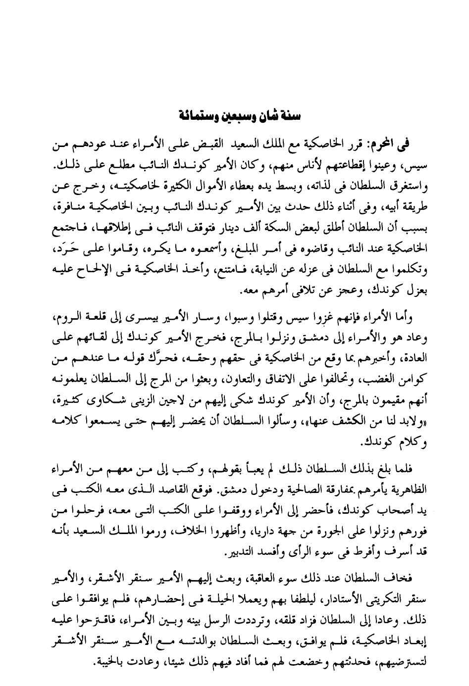 سنة ثَمَان وَسبعين وسِتمِائَة فِي الْمحرم: قرر الخاصكية مَعَ الْملك السعيد الْقَبْض على الْأُمَرَاء عِنْد عودهم من سيس وعينوا إقطاعتهم لِأُنَاس مِنْهُم وَكَانَ الْأَمِير كوندك النَّائِب مطلع على ذَلِك. واستغرق السُّلْطَان فِي لذاته وَبسط يَده بعطاء الْأَمْوَال الْكَثِيرَة لخاصكيته وَخرج عَن طَريقَة أَبِيه وَفِي أثْنَاء ذَلِك حدث بَين الْأَمِير كوندك النَّائِب وَبَين الخاصكية منافرة بِسَبَب أَن السُّلْطَان أطلق لبَعض السِّكَّة ألف دِينَار فتوقف النَّائِب فِي إِطْلَاقهَا فَاجْتمع الخاصكية عِنْد النَّائِب وقاضوه فِي أَمر الْمبلغ وأسمعوه مَا يكره وَقَامُوا على حرد وَتَكَلَّمُوا مَعَ السُّلْطَان فِي عَزله عَن النِّيَابَة فَامْتنعَ وَأخذ الخاصكية فِي الإلحاح عَلَيْهِ بعزل كوندك وَعجز عَن تلافي أَمرهم مَعَه. وَأما الْأُمَرَاء فَإِنَّهُم غزوا سيس وَقتلُوا وَسبوا وَسَار الْأَمِير بيسري إِلَى قلعة الرّوم وَعَاد هُوَ والأمراء إِلَى دمشق ونزلوا بالمرج فَخرج الْأَمِير كوندك إِلَى لقائهم على الْعَادة وَأخْبرهمْ. مِمَّا وَقع من الخاصكية فِي حَقهم وَحقه فحرك قَوْله مَا عِنْدهم من كوامن الْغَضَب وتحالفوا على الِاتِّفَاق والتعاون وبعثوا من المرج إِلَى السُّلْطَان يعلمونه إِنَّهُم مقيمون بالمرج وَأَن الْأَمِير كوندك شكي إِلَيْهِم من لاجين الزيني شكاوى كَثِيرَة وَلَا بُد لنا من الْكَشْف عَنْهَا وسألوا السُّلْطَان أَن يحضر إِلَيْهِم فَلَمَّا بلغ بذلك السُّلْطَان ذَلِك لم يعبأ بقَوْلهمْ وَكتب إِلَى من مَعَهم من الْأُمَرَاء الظَّاهِرِيَّة يَأْمُرهُم. بمفارقة الصالحية وَدخُول دمشق. فَوَقع القاصد الَّذِي مَعَه الْكتب فِي يَد أَصْحَاب كوندك فأحضر إِلَى الْأُمَرَاء ووقفوا على الْكتب الَّتِي مَعَه فرحلوا من فورهم ونزلوا على الجورة من جِهَة داريا وأظهروا الْخلاف ورموا الْملك السعيد بِأَنَّهُ قد أسرف وأفرط فِي سوء الرَّأْي وأفسد التَّدْبِير. فخاف السُّلْطَان عِنْد ذَلِك سوء الْعَاقِبَة وَبعث إِلَيْهِم الْأَمِير سنقر الْأَشْقَر والأمير سنقر التكريتي الأستادار ليلطفا بهم ويعملا الْحِيلَة فِي إحضارهم فَلم يوافقوا على ذَلِك. وعادا إِلَى السُّلْطَان فَزَاد قلقه وترددت الرُّسُل بَينه وَبَين الْأُمَرَاء فاقترحوا عَلَيْهِ إبعاد الخاصكية فَلم يُوَافق وَبعث السُّلْطَان بوالدته مَعَ الْأَمِير سنقر الْأَشْقَر لتسترضيهم فحدثتهم وخضعت لَهُم فَمَا أَفَادَ فيهم ذَلِك شَيْئا وعادت بالخيبة.