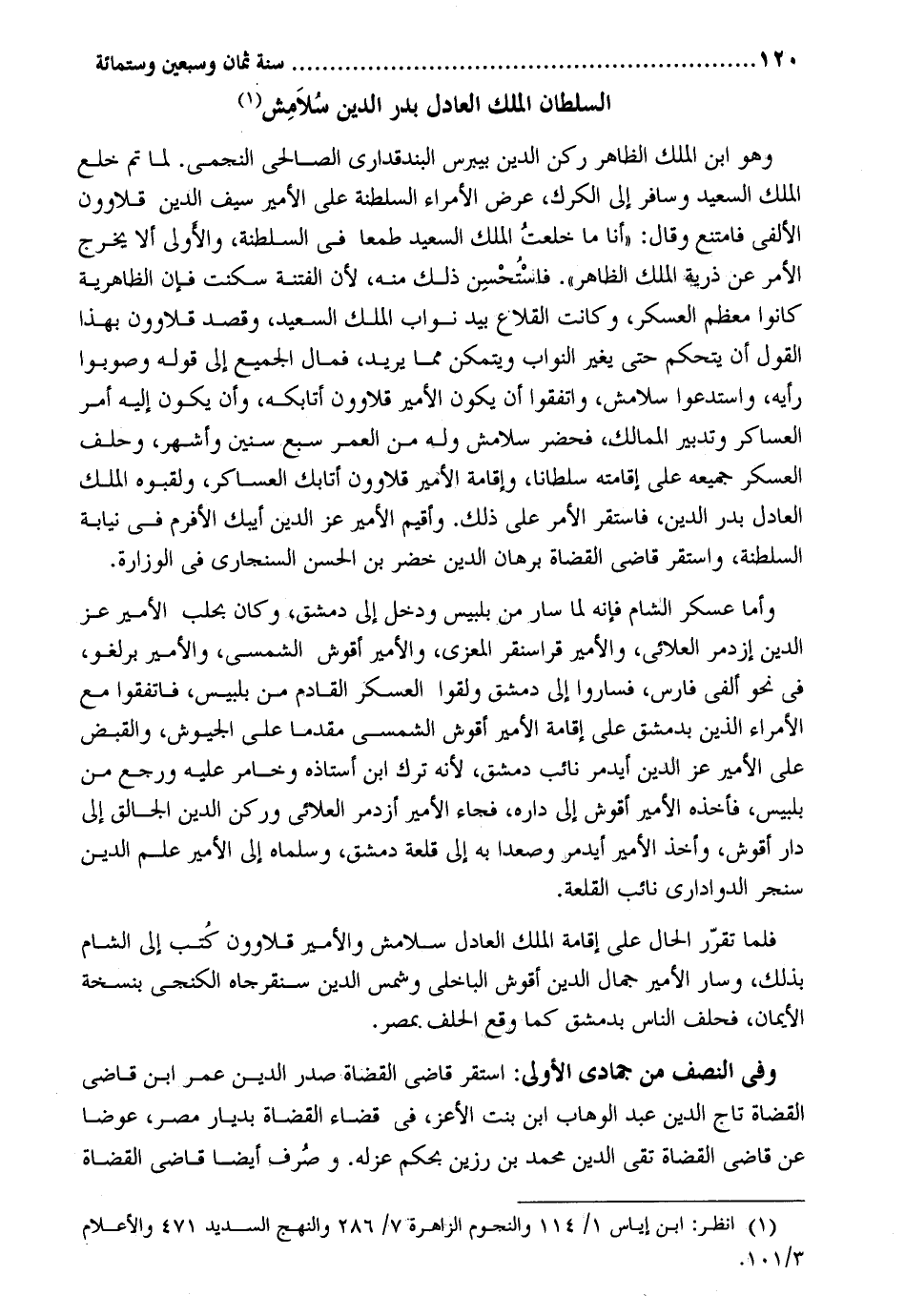 السُّلْطَان الْملك الْعَادِل بدر الدّين سلامش وَهُوَ ابْن الْملك الظَّاهِر ركن الدّين بيبرس البندقداري الصَّالِحِي النجمي. لما تمّ خلع الْملك السعيد وسافر إِلَى الكرك عرض الْأُمَرَاء السلطنة على الْأَمِير سيف الدّين قلاوون الألفي فَامْتنعَ وَقَالَ: أَنا مَا خلعت الْملك السعيد طَمَعا فِي السلطنة وَالْأولَى أَلا يخرج الْأَمر عَن ذُرِّيَّة الْملك الظَّاهِر. فَاسْتحْسن ذَلِك مِنْهُ لِأَن الْفِتْنَة سكنت فَإِن الظاهريه كَانُوا مُعظم الْعَسْكَر وَكَانَت القلاع بيد نواب الْملك السعيد وَقصد قلاوون بِهَذَا القَوْل أَن يتحكم حَتَّى يُغير النواب ويتمكن مِمَّا يُرِيد فَمَال الْجَمِيع إِلَى قَوْله وصوبوا رَأْيه واستدعوا سلامش وَاتَّفَقُوا أَن يكون الْأَمِير قلاوون أتابكه وَأَن يكون إِلَيْهِ أَمر العساكر وتدبير الممالك فَحَضَرَ سلامش وَله من الْعُمر سبع سِنِين وَأشهر وَحلف الْعَسْكَر جَمِيعه على إِقَامَته سُلْطَانا وَإِقَامَة الْأَمِير قلاوون أتابك العساكر ولقبوه الْملك الْعَادِل بدر الدّين فاستقر الْأَمر على ذَلِك. وأقيم الْأَمِير عز الدّين أيبك الأفرم فِي نِيَابَة السلطنة وَاسْتقر قَاضِي الْقُضَاة برهَان الدّين خضر بن الْحسن السنجاري فِي الوزارة. وَأما عَسْكَر الشَّام فَإِنَّهُ لما سَار من بلبيس وَدخل إِلَى دمشق وَكَانَ بحلب الْأَمِير عز الدّين إزدمر العلائي والأمير قراسنقر المعزي والأمير أقوش الشمسي والأمير برلغو فِي نَحْو ألفي فَارس فَسَارُوا إِلَى دمشق ولقوا الْعَسْكَر القادم من بلبيس فاتفقوا مَعَ الْأُمَرَاء الَّذين بِدِمَشْق على إِقَامَة الْأَمِير أقوش الشمسي مقدما على الجيوش وَالْقَبْض على الْأَمِير عز الدّين أيدمر نَائِب دمشق لِأَنَّهُ ترك ابْن أستاذه وخامر عَلَيْهِ وَرجع من بلبيس فَأَخذه الْأَمِير أقوش إِلَى دَاره فجَاء الْأَمِير أزدمر العلائي وركن الدّين الجالق إِلَى دَار أقوش وَأخذ الْأَمِير أيدمر وصعدا بِهِ إِلَى قلعة دمشق وسلماه إِلَى الْأَمِير علم الدّين سنجر الدواداري نَائِب القلعة. فَلَمَّا تقرر الْحَال على إِقَامَة الْملك. الْعَادِل سلامش والأمير قلاوون كتب إِلَى الشَّام بذلك وَسَار الْأَمِير جمال الدّين أقوش الباخلي وشمس الدّين سنقرجاه الكنجي بنسخة الْإِيمَان فَحلف النَّاس بِدِمَشْق كَمَا وَقع الْحلف بِمصْر. وَفِي النّصْف من جُمَادَى الأولى: اسْتَقر قَاضِي الْقُضَاة صدر الدّين عمر ابْن قَاضِي الْقُضَاة تَاج الدّين عبد الْوَهَّاب ابْن بنت الْأَعَز فِي قَضَاء الْقُضَاة بديار مصر عوضا عَن قَاضِي الْقُضَاة تَقِيّ الدّين مُحَمَّد بن رزين بِحكم عَزله. وَصرف أَيْضا قَاضِي الْقُضَاة