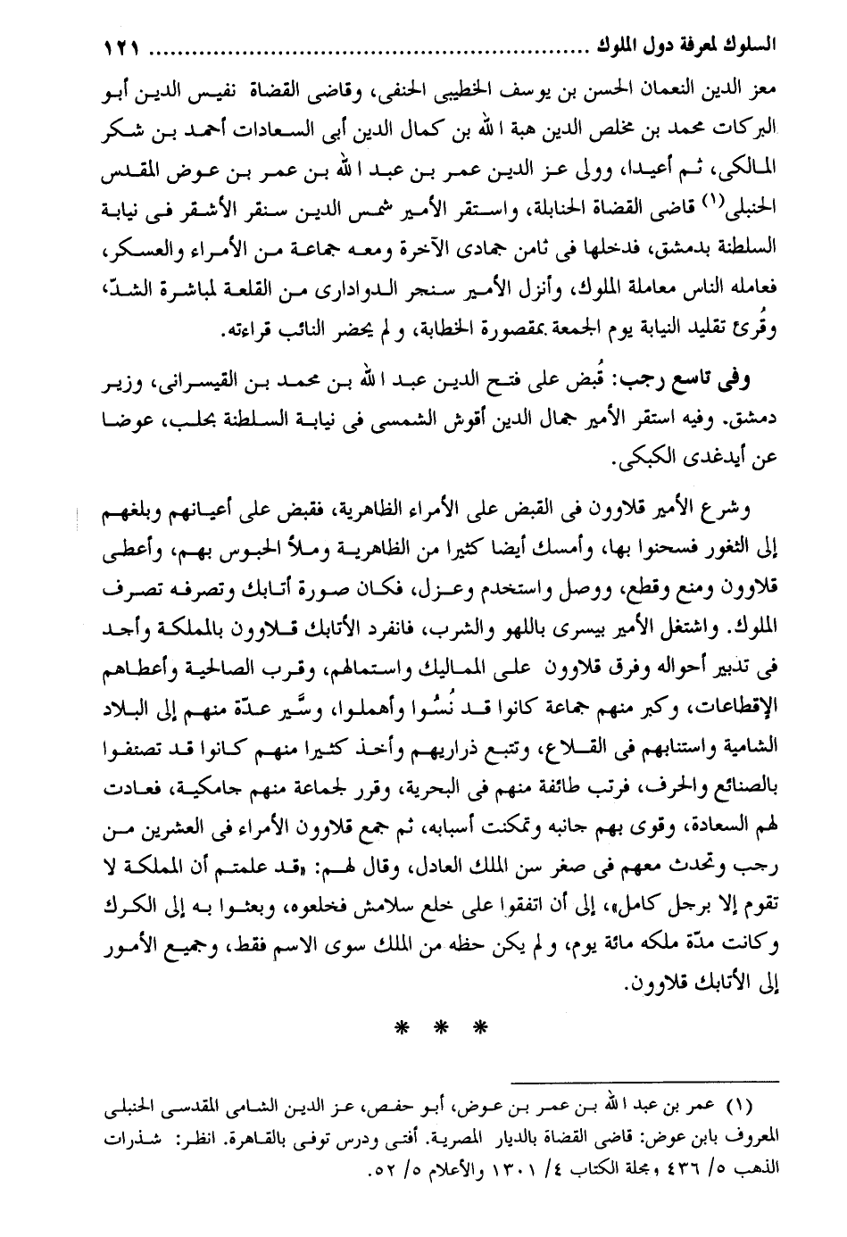 معز الدّين النُّعْمَان الْحسن بن يُوسُف الخطبي الْحَنَفِيّ وقاضي الْقُضَاة نَفِيس الدّين أَبُو البركات مُحَمَّد بن مخلص الدّين هبة الله بن كَمَال الدّين أبي السعادات أَحْمد بن شكر الْمَالِكِي ثمَّ أعيدا وَولي عز الدّين عمر بن عبد الله بن عمر بن عوض الْمُقَدّس الْحَنْبَلِيّ قَاضِي الْقُضَاة الْحَنَابِلَة وَاسْتقر الْأَمِير شمس الدّين سنقر الْأَشْقَر فِي نِيَابَة السلطنة بِدِمَشْق فَدَخلَهَا فِي ثامن جُمَادَى الْآخِرَة وَمَعَهُ جمَاعَة من الْأُمَرَاء والعسكر فعامله النَّاس مُعَاملَة الْمُلُوك وَأنزل الْأَمِير سنجر الدواداري من القلعة لمباشرة الشد وَقُرِئَ تَقْلِيد النِّيَابَة يَوْم الْجُمُعَة بمقصورة الخطابة وَلم يحضر النَّائِب قِرَاءَته. وَفِي تَاسِع رَجَب: قبض على فتح الدّين عبد الله بن مُحَمَّد بن القيسراني وَزِير دمشق. وَفِيه اسْتَقر الْأَمِير جمال الدّين أقوش الشمسي فِي نِيَابَة السلطنة بحلب عوضا عَن أيدغدي الكبكي. وَشرع الْأَمِير قلاوون فِي الْقَبْض على الْأُمَرَاء الظَّاهِرِيَّة فَقبض على أعيانهم وبلغهم إِلَى الثغور فسحنوا بهَا وَأمْسك أَيْضا كثيرا من الظَّاهِرِيَّة وملأ الحبوس بهم وَأعْطِي قلاوون وَمنع وَقطع وَوصل واستخدم وعزل فَكَانَ صُورَة أتابك وتصرفه تصرف الْمُلُوك. واشتغل الْأَمِير بيسري باللهو وَالشرب فَانْفَرد الأتابك قلاوون بالمملكة وَأَجد فِي تدير أَحْوَاله وَفرق قلاوون على المماليك واستمالهم وَقرب الصالحية وَأَعْطَاهُمْ الإقطاعات وَكبر مِنْهُم جمَاعَة كَانُوا قد نسوا وأهملوا وسير عدَّة مِنْهُم إِلَى الْبِلَاد الشامية واستنابهم فِي القلاع وتتبع ذَرَارِيهمْ وَأخذ كثيرا مِنْهُم كَانُوا قد تصنفوا بالصنائع والحرف فرتب طَائِفَة مِنْهُم فِي البحرية وَقرر لجَماعَة مِنْهُم جامكية فَعَادَت لَهُم السَّعَادَة وَقَوي بهم جَانِبه وتمكنت أَسبَابه ثمَّ جمع قلاوون الْأُمَرَاء فِي الْعشْرين من رَجَب وتحدث مَعَهم فِي صغر سنّ الْملك الْعَادِل وَقَالَ لَهُم: قد علمْتُم أَن المملكة لَا تقوم إِلَّا بِرَجُل كَامِل إِلَى أَن اتَّفقُوا على خلع سلامش فخلعوه وبعثوا بِهِ إِلَى الكرك وَكَانَت مُدَّة ملكه مائَة يَوْم وَلم يكن حَظه من الْملك سوي الِاسْم فَقَط وَجَمِيع الْأُمُور إِلَى الأتابك قلاوون.