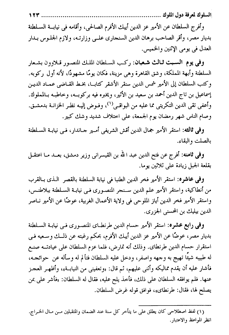 وَأَفْرج السُّلْطَان عَن الْأَمِير عز الدّين أيبك الأفرم الصَّالِحِي وأقامه فِي نِيَابَة السلطة بديار مصر وَأقر الصاحب برهَان الدّين السنجاري على وزارته ولازم الْجُلُوس بدار الْعدْل فِي يومي الْإِثْنَيْنِ وَفِي يَوْم السبت ثَالِث شعْبَان. ركب السُّلْطَان الْملك الْمَنْصُور قلاوون بشعار السلطنه وأبهة المملكة وشق الْقَاهِرَة وَهِي مزينة فَكَانَ يَوْمًا مشهودا لِأَنَّهُ أول ركُوبه. وَكتب السُّلْطَان إِلَى لأمير شمس الدّين سنقر الْأَشْقَر كتابا بِخَط القَاضِي عماد الدّين إِسْمَاعِيل بن تَاج الدّين أَحْمد بن سعيد بن الْأَثِير ويخبره فِيهِ بركوبه وخاطبه بالمملوك. وأعفي تَقِيّ الدّين التكريتي مِمَّا عَلَيْهِ من الْبَوَاقِي وفوض إِلَيْهِ نظر الخزانة بِدِمَشْق. وَصَامَ النَّاس شهر رَمَضَان يَوْم الْجُمُعَة على اخْتِلَاف شَدِيد وَشك كَبِير. وَفِي ثالثه. اسْتَقر الْأَمِير جمال الدّين أقش الشريفي أَمِير جاندار فِي نِيَابَة السلطنة بالصلت والبقاء. وَفِي ثامنه: أفرج عَن فتح الدّين عبد الله بن القيسراني وَزِير دمشق بعد مَا اعتقل بقلعة الْجَبَل زِيَادَة على ثَلَاثِينَ يَوْمًا. وَفِي عاشره: اسْتَقر الْأَمِير فَخر الدّين الطنبا فِي نِيَابَة السلطنة بِالْقصرِ الَّذِي بِالْقربِ من أنطاكية وَاسْتقر الْأَمِير علم الدّين سنجر المنصوري فِي نِيَابَة السلطنة ببلاطنس وَاسْتقر الْأَمِير فَخر الدّين أياز الملوحي فِي ولَايَة الْأَعْمَال الغربية عوضا عَن الْأَمِير نَاصِر الدّين بيليك بن المحسني الْجَزرِي. وَفِي رَابِع عشره: اسْتَقر الْأَمِير حسام الدّين طرنطاي المنصوري فِي نِيَابَة السلطنة بديار مصر عوضا عَن الْأَمِير عز الدّين أيبك الأفرم بِحكم رغبته عَن ذَلِك وسعيه فِي اسْتِقْرَار حسام الدّين طرنطاي. وَذَلِكَ إِنَّه تمارض فَلَمَّا عزم السُّلْطَان على عيادته صنع لَهُ طبيبه شَيْئا تهيج بِهِ وَجهه واصفر وَدخل عَلَيْهِ السُّلْطَان فتألم لَهُ وَسَأَلَهُ عَن حَوَائِجه فَأَشَارَ عَلَيْهِ أَن يقدم مماليكه وأثني عَلَيْهِم ثمَّ قَالَ: وتعفيني من النِّيَابَة وَأظْهر الْعَجز عَنْهَا. فَلم يُوَافقهُ السُّلْطَان على ذَلِك فَأخذ يلح عَلَيْهِ فَقَالَ لَهُ السُّلْطَان: فأشر على بِمن يصلح لَهَا فَقَالَ: طرنطاي فَوَافَقَ قَوْله غَرَض السُّلْطَان.