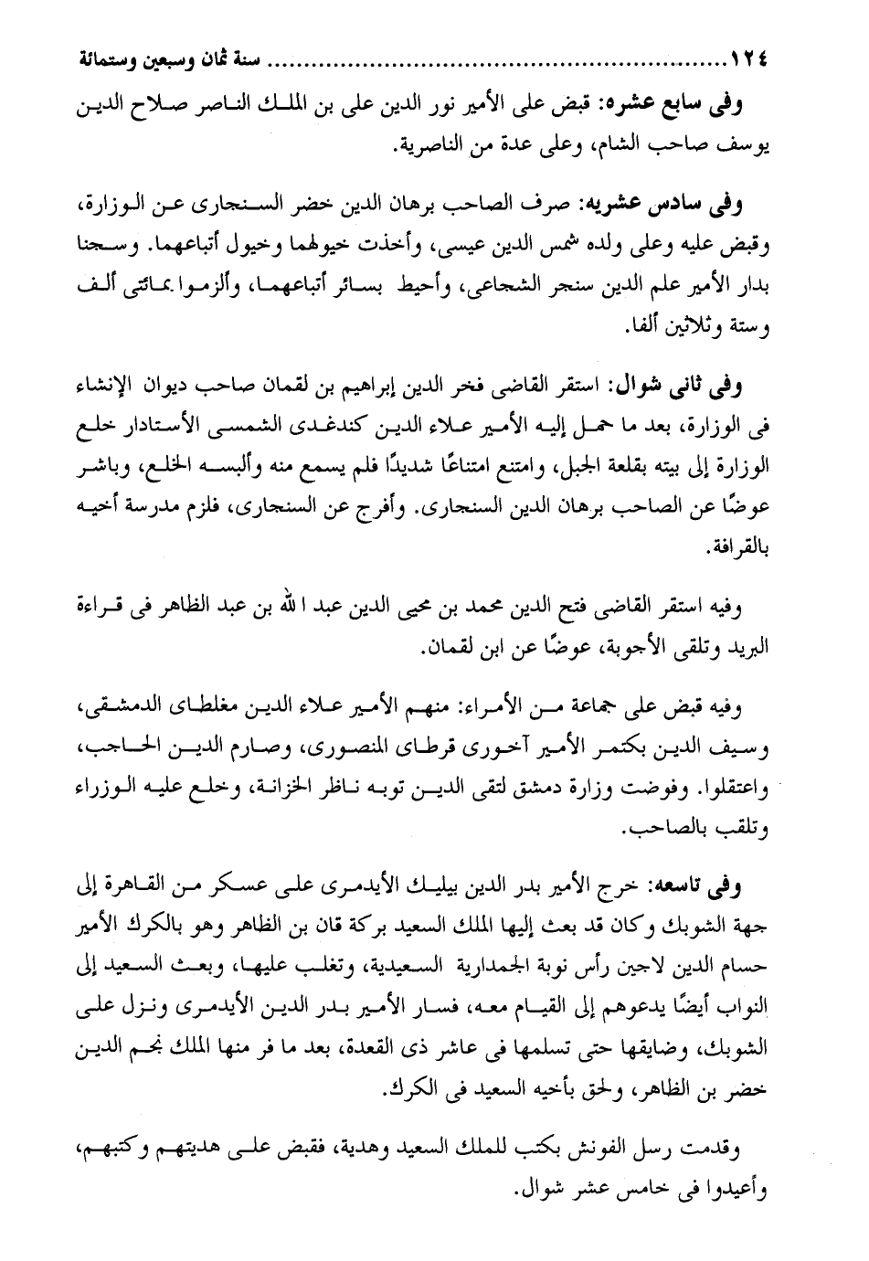 وَفِي سَابِع عشره: قبض على الْأَمِير نور الدّين على بن الْملك النَّاصِر صَلَاح الدّين يُوسُف صَاحب الشَّام وعَلى عدَّة من الناصرية. وَفِي سادس عشريه: صرف الصاحب برهَان الدّين خضر السنجاري عَن الوزارة وَقبض عَلَيْهِ وعَلى وَلَده شمس الدّين عيسي وَأخذت خيولهما وخيول أتباعهما. وسجنا بدار الْأَمِير علم الدّين سنجر الشجاعي وأحيط بِسَائِر أتباعهما وألزموا بِمِائَتي ألف وَسِتَّة وَثَلَاثِينَ ألفا. وَفِي ثَانِي شَوَّال: اسْتَقر القَاضِي فَخر الدّين إِبْرَاهِيم بن لُقْمَان صَاحب ديوَان الْإِنْشَاء فِي الوزارة بعد مَا حمل إِلَيْهِ الْأَمِير عَلَاء الدّين كندغدي الشمسي الأستادار خلع الوزارة إِلَى بَيته بقلعه الْجَبَل وَامْتنع امتناعا شَدِيدا فَلم يسمع مِنْهُ وَألبسهُ الْخلْع وباشر عوضا عَن الصاحب برهَان وَفِيه اسْتَقر القَاضِي فتح الدّين مُحَمَّد بن محيي الدّين عبد الله بن عبد الظَّاهِر فِي قِرَاءَة الْبَرِيد وتلقي الْأَجْوِبَة عوضا عَن ابْن لُقْمَان. وَفِيه قبض على جمَاعَة من الْأُمَرَاء. مِنْهُم الْأَمِير عَلَاء الدّين مغلطاي الدِّمَشْقِي وَسيف الدّين بكتمر الْأَمِير آخوري قرطاي المنصوري وصارم الدّين الْحَاجِب واعتقلوا. وفوضت وزارة دمشق لتقي الدّين توبه نَاظر الخزانة وخلع عَلَيْهِ الوزراء وتلقب بالصاحب. وَفِي تاسعه: خرج الْأَمِير بدر الدّين بيليك الأيدمري على عَسْكَر من الْقَاهِرَة إِلَى جِهَة الشوبك وَكَانَ قد بعث إِلَيْهَا الْملك السعيد بركَة قان بن الظَّاهِر وَهُوَ بالكرك الْأَمِير حسام الدّين لاجين رَأس نوبَة الجمدارية السعيدية وتغلب عَلَيْهَا وَبعث السعيد إِلَى النواب أَيْضا يَدعُوهُم إِلَى الْقيام مَعَه فَسَار الْأَمِير بدر الدّين الأيدمري وَنزل على الشوبك وضايقها حَتَّى تسلمها فِي عَاشر ذِي الْقعدَة بعد مَا فر مِنْهَا الْملك نجم الدّين خضر بن الظَّاهِر وَلحق بأَخيه السعيد فِي الكرك. وقدمت رسل الفونش بكتب للْملك السعيد وهدية فَقبض على هديتهم وكتبهم وأعيدوا فِي خَامِس عشر شَوَّال.
