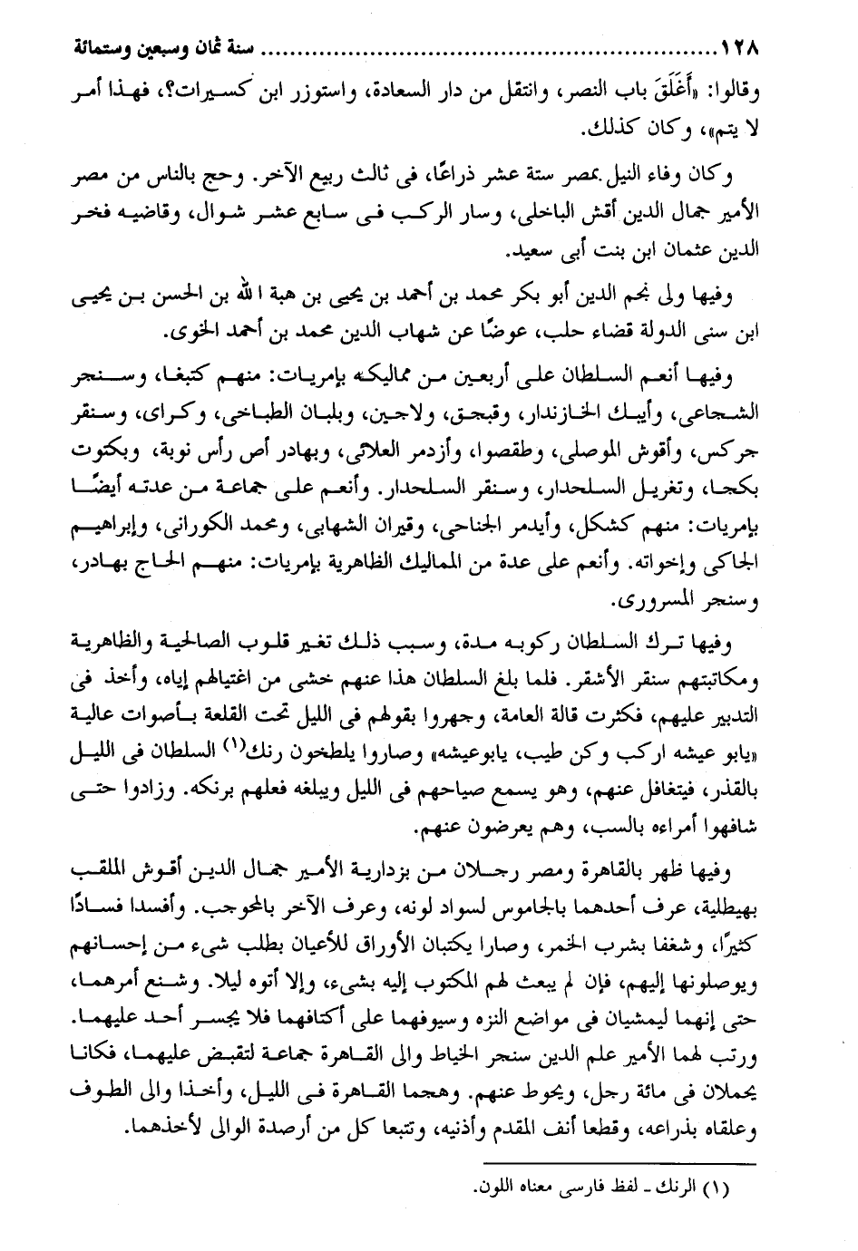 وَقَالُوا: أغلق بَاب النَّصْر وانتقل من دَار السَّعَادَة واستوزر ابْن كسيرات فَهَذَا أَمر لَا يتم وَكَانَ كَذَلِك. وَكَانَ وَفَاء النّيل بِمصْر سِتَّة عشر ذِرَاعا فِي ثَالِث ربيع الآخر. وَحج بِالنَّاسِ من مصر الْأَمِير جمال الدّين أقش الباخلي وَسَار الركب فِي سَابِع عشر شَوَّال وقاضيه فَخر الدّين عُثْمَان ابْن بنت أبي سعيد. وفيهَا ولي نجم الدّين أَبُو بكر مُحَمَّد بن أَحْمد بن يحيي بن هبة الله بن الْحسن بن يحيي ابْن سني الدولة قَضَاء حلب عوضا عَن شهَاب الدّين مُحَمَّد بن أَحْمد الخوي. وفيهَا أنعم السُّلْطَان على أَرْبَعِينَ من مماليكه بإمريات: مِنْهُم كتبغا وسنجر الشجاعي وأيبك الخازندار وقبجق ولاجين وبلبان الطباخي وكراي وسنفر جركس وأقوش الْموصِلِي وطقصوا وأزدمر العلائي وبهادر أص رَأس نوبَة وبكتوت بكجا وتغريل السلحدار وسنقر السلحدار. وأنعم على جمَاعَة من عدته أَيْضا بإمريات: مِنْهُم كشكل وأيدمر الجناحي وقيران الشهابي وَمُحَمّد الكوراني وَإِبْرَاهِيم الجاكي وإخواته. وأنعم على عدَّة من المماليك الظَّاهِرِيَّة بإمريات: مِنْهُم الْحَاج بهادر وسنجر المسروري. وفيهَا ترك السُّلْطَان ركُوبه مُدَّة وَسبب ذَلِك تغير قُلُوب الصالحية والظاهرية ومكاتبتهم سنقر الْأَشْقَر. فَلَمَّا بلغ السُّلْطَان هَذَا عَنْهُم خشِي من اغتيالهم إِيَّاه وَأخذ فِي التَّدْبِير عَلَيْهِم فكثرت قالة الْعَامَّة وجهروا بقَوْلهمْ فِي اللَّيْل تَحت القلعة بِأَصْوَات عالية يَا بو عيشه اركب وَكن طيب يَا بو عيشه وصاروا يلطخون رنك السُّلْطَان فِي اللَّيْل بالقذر فيتغافل عَنْهُم وَهُوَ يسمع صِيَاحهمْ فِي اللَّيْل ويبلغه فعلهم برنكه. وَزَادُوا حَتَّى شافهوا أمراءه بالسب وهم يعرضون عَنْهُم. وفيهَا ظهر بِالْقَاهِرَةِ ومصر رجلَانِ من بزدارية الْأَمِير جمال الدّين أقوش الملقب بهيطلية عرف أَحدهمَا بالجاموس لسواد لَونه وَعرف الآخر بالمحوجب. وأفسدا فَسَادًا كثيرا وشغفا بِشرب الْخمر وصارا يكتبان الأوراق للأعيان بِطَلَب شَيْء من إحسانهم ويوصلونها إِلَيْهِم فَإِن لم يبْعَث لَهُم الْمَكْتُوب إِلَيْهِ بِشَيْء وَإِلَّا أَتَوْهُ لَيْلًا. وشنع أَمرهمَا حَتَّى إنَّهُمَا ليمشيان فِي مَوَاضِع النزه وسيوفهما على أكتافهما فَلَا يَجْسُر أحد عَلَيْهِمَا. ورتب لَهما الْأَمِير علم الدّين سنجر الْخياط وَإِلَى الْقَاهِرَة جمَاعَة لتقبض عَلَيْهِمَا فَكَانَا يحْملَانِ فِي مائَة رجل ويحوط عَنْهُم. وهجما الْقَاهِرَة فِي اللَّيْل وأخذا وَإِلَى الطوف وعلقاه بذراعه وقطعا أنف الْمُقدم وَأُذُنَيْهِ وتتبعا كل من أرصدة الْوَالِي لأخذهما.