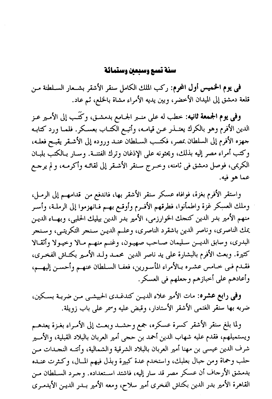 سنة تسع وَسبعين وسِتمِائَة فِي يَوْم الْخَمِيس أول الْمحرم: ركب الْملك الْكَامِل سنقر الْأَشْقَر بشعار السلطنة من قلعة دمشق إِلَى الميدان الْأَخْضَر وَبَين يَدَيْهِ الْأُمَرَاء مشَاة بِالْخلْعِ ثمَّ عَاد. وَفِي يَوْم الْجُمُعَة ثَانِيه: خطب لَهُ على مِنْبَر الْجَامِع بِدِمَشْق وَكتب إِلَى الْأَمِير عز الدّين الأفرم وَهُوَ بالكرك يعْتَذر عَن قِيَامه وأتبع الْكتاب بعسكر. فَلَمَّا ورد كِتَابه جهزه الأفرم إِلَى السُّلْطَان بِمصْر فَكتب السُّلْطَان عِنْد وُرُوده إِلَى الْأَشْقَر يقبح فعله وَكتب أُمَرَاء مصر إِلَيْهِ بذلك ويحثونه على الإذغان وَترك الْفِتْنَة. وَسَار بالكتب بلبان الكريمي فوصل دمشق فِي ثامنه وَخرج سنقر الْأَشْقَر إِلَى لِقَائِه وأكرمه وَلم يرجع عَمَّا هُوَ فِيهِ. وَاسْتقر الأفرم بغزة فوافاه عَسْكَر سنقر الْأَشْقَر بهَا فَانْدفع من قدامهم إِلَى الرمل وَملك الْعَسْكَر غَزَّة واطمأنوا فطرقهم الأفرم وأوقع بهم فَانْهَزَمُوا إِلَى الرملة وَأسر مِنْهُم الْأَمِير بدر الدّين كنجك الْخَوَارِزْمِيّ الْأَمِير بدر الدّين بيليك الْحلَبِي وبهاء الدّين يمك الناصري وناصر الدّين باشقرد الناصري وَعلم الدّين سنجر التكريتي وسنجر البدري وسابق الدّين سُلَيْمَان صَاحب صهيون وغنم مِنْهُم مَالا وخيولا وأثقالا كَثِيرَة. وَبعث الأفرم بالبشارة على يَد نَاصِر الدّين مُحَمَّد ولد الْأَمِير بكتاش الفخري فَقدم فِي خَامِس عشره بالأمراء المأسورين فَعَفَا السُّلْطَان عَنْهُم وَأحسن إِلَيْهِم وأعادهم على أخبازهم وجعلهم فِي الْعَسْكَر.