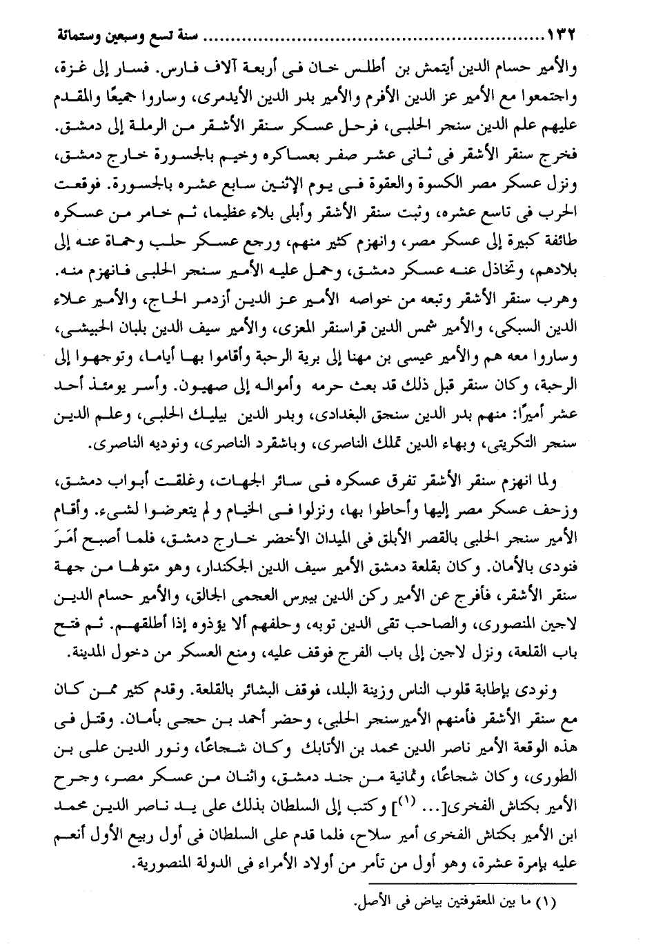 والأمير حسام الدّين أيتمش بن أطلس خَان فِي أَرْبَعَة آلَاف فَارس. فَسَار إِلَى غزه واجتمعوا مَعَ الْأَمِير عز الدّين الأفرم والأمير بدر الدّين الأيدمري وَسَارُوا جَمِيعًا والمقدم عَلَيْهِم علم الدّين سنجر الْحلَبِي فَرَحل عَسْكَر سنقر الْأَشْقَر من الرملة إِلَى دمشق. فَخرج سنقر الْأَشْقَر فِي ثَانِي عشر صفر بعساكره وخيم بالجسورة خَارج دمشق وَنزل عَسْكَر مصر الْكسْوَة والعقوة فِي يَوْم الْإِثْنَيْنِ سَابِع عشره بالجسورة. فَوَقَعت الْحَرْب فِي تَاسِع عشره وَثَبت سنقر الْأَشْقَر وأبلي بلَاء عَظِيما ثمَّ خامر من عسكره طَائِفَة كَبِيرَة إِلَى عَسْكَر مصر وَانْهَزَمَ كثير مِنْهُم وَرجع عَسْكَر حلب وحماة عَنهُ إِلَى بِلَادهمْ وتخاذل عَنهُ عَسْكَر دمشق وَحمل عَلَيْهِ الْأَمِير سنجر الْحلَبِي فَانْهَزَمَ مِنْهُ. وهرب سنقر الْأَشْقَر وَتَبعهُ من خواصه الْأَمِير عز الدّين أزدمر الْحَاج والأمير عَلَاء الدّين السُّبْكِيّ والأمير شمس الدّين قراسنقر المعزي والأمير سيف الدّين بلبان الحبيشي وَسَارُوا مَعَه هم والأمير عيسي بن مهنا إِلَى بَريَّة الرحبة وَأَقَامُوا بهَا أَيَّامًا وتوجهوا إِلَى الرحبة وَكَانَ سنقر قبل ذَلِك قد بعث حرمه وأمواله إِلَى صهيون. وَأسر يَوْمئِذٍ أحد عشر أَمِيرا: مِنْهُم بدر الدّين سنجق الْبَغْدَادِيّ وَبدر الدّين بيليك الْحلَبِي وَعلم الدّين سنجر التكريتي وبهاء الدّين تملك الناصري وباشقرد الناصري ونوديه الناصري. وَلما انهزم سنقر الْأَشْقَر تفرق عسكره فِي سَائِر الْجِهَات وغلقت أَبْوَاب دمشق وزحف عَسْكَر مصر إِلَيْهَا وَأَحَاطُوا بهَا ونزلوا فِي الْخيام وَلم يتَعَرَّضُوا لشَيْء. وَأقَام الْأَمِير سنجر الْحلَبِي بِالْقصرِ الأبلق فِي الميدان الْأَخْضَر خَارج دمشق فَلَمَّا أصبح أَمر فَنُوديَ بالأمان. وَكَانَ بقلعة دمشق الْأَمِير سيف الدّين الجكندار وَهُوَ متولها من جِهَة سنقر الْأَشْقَر فأفرج عَن الْأَمِير ركن الدّين بيبرس العجمي الجالق والأمير حسام الدّين لاجين المنصوري والصاحب تَقِيّ الدّين توبه وحلفهم أَلا يؤذوه إِذا أطلقهُم. ثمَّ فتح بَاب القلعة وَنزل لاجين إِلَى بَاب الْفرج فَوقف عَلَيْهِ وَمنع الْعَسْكَر من دُخُول الْمَدِينَة. وَنُودِيَ بإطابة قُلُوب النَّاس وزينة الْبَلَد فَوقف البشائر بالقلعة. وَقدم كثير مِمَّن كَانَ مَعَ سنقر الْأَشْقَر فَأَمنَهُمْ الْأَمِير سنجر الْحلَبِي وَحضر أَحْمد بن حجي بِأَمَان. وَقتل فِي هَذِه الْوَقْعَة الْأَمِير نَاصِر الدّين مُحَمَّد بن الأتابك وَكَانَ شجاعا وَنور الدّين على بن الطوري وَكَانَ شجاعاً وَثَمَانِية من جند دمشق وَاثْنَانِ من عَسْكَر مصر وجرح الْأَمِير بكتاش الفخري وَكتب إِلَى السُّلْطَان بذلك على يَد نَاصِر الدّين مُحَمَّد ابْن الْأَمِير بكتاش الفخري أَمِير سلَاح فَلَمَّا قدم على السُّلْطَان فِي أول ربيع الأول أنعم عَلَيْهِ بإمرة عشرَة وَهُوَ أول من تَأمر من أَوْلَاد الْأُمَرَاء فِي الدولة المنصورية.