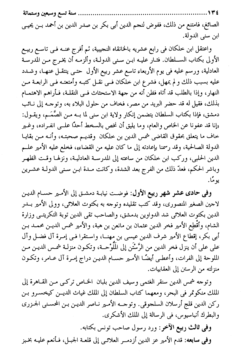 الصَّائِغ فَامْتنعَ من ذَلِك ففوض لنجم الدّين أبي بكر بن صدر الدّين بن أَحْمد بن يحيي ابْن سني الدولة. واعتقل ابْن خلكان فِي رَابِع عشريه بالخانقاه النجيبية ثمَّ أفرج عَنهُ فِي تَاسِع ربيع الأولى بِكِتَاب السُّلْطَان. فثار عَلَيْهِ ابْن سني الدولة وألزمه أَن يخرج من الْمدرسَة العادلية ورسم عَلَيْهِ فِي يَوْم الْأَرْبَعَاء تَاسِع عشر ربيع الأول حَتَّى ينْتَقل عَنْهَا وشدد عَلَيْهِ بِسَبَب ذَلِك وَلم يُمْهل فشرع ابْن خلكان فِي نقل كتبه وأمتعته فِي الرَّابِعَة من النَّهَار وَإِذا بِالطَّلَبِ قد أَتَاهُ فَظن أَنه من جِهَة الاستحثاث فِي النقلَة فَأَرَاهُم الاهتمام بذلك فَقيل لَهُ قد حضر الْبَرِيد من مصر فخاف من حُلُول الْبلَاء بِهِ وَتوجه إِلَى نَائِب دمشق فَإِذا بِكِتَاب السُّلْطَان يتَضَمَّن إِنْكَار ولَايَة ابْن سني لما بِهِ من الصمم وَيَقُول: إِنَّا قد عَفَوْنَا عَن الْخَاص وَالْعَام وَمَا يَلِيق أَن نخص بالسخط أحدا على انْفِرَاده وَغير حاف مَا يتَعَلَّق بِحُقُوق القَاضِي شمس الدّين بن خلكان وقديم صحبته وَأَنه من بقايا الدولة الصالحية وَقد رسمنا بإعادته إِلَى مَا كَانَ عَلَيْهِ من الْقَضَاء فَخلع عَلَيْهِ الْأَمِير علم الدّين الْحلَبِي وَركب ابْن خلكان من سَاعَته إِلَى الْمدرسَة العادلية ونزلها وَقت الظّهْر وباشر الحكم فعد ذَلِك من الْفرج بعد الشدَّة وَكَانَت مُدَّة ابْن سني الدولة عشْرين يَوْمًا. وَفِي حادي عشر شهر ربيع الأول: فوضت نِيَابَة دمشق إِلَى الْأَمِير حسام الدّين لاجين الصَّغِير المنصوري وَقد كتب تَقْلِيده وَتوجه بِهِ بكتوت العلائي وَولي الْأَمِير بدر الدّين بكتوت العلائي شدّ الدَّوَاوِين بِدِمَشْق والصاحب تَقِيّ الدّين تَوْبَة التكريتي وزارة الشَّام وأقطع الْأَمِير فَخر الدّين عُثْمَان بن مانعن بن هبة والأمير شمس الدّين مُحَمَّد بن أبي بكر إقطاع الْأَمِير شرف الدّين عيسي بن مهنا واستقرا فِي إمرة آل الْفضل وَآل عَليّ على أَن ينزل فَخر الدّين من الرستن إِلَى الملوحة وَتَكون منزلَة شمس الدّين من الملوحة إِلَى الْفُرَات وَأعْطِي أَيْضا الْأَمِير حسام الدّين دراج إمرة آل عَامر وَتَكون مَنْزِلَته من الرستن إِلَى العقابيات. وَتوجه شمس الدّين سنقر الغتمي وَسيف الدّين بلبان الْخَاص تركي من الْقَاهِرَة إِلَى الْملك منكوتمر فِي الْبَحْر ومعهما كتاب السُّلْطَان إِلَى الْملك غياث الدّين كيخسرو بن ركن الدّين قلج أرسلان السلجوقي. وَتوجه الْأَمِير نَاصِر الدّين بن المحسني الْجَزرِي والبطرك أنباسيوس فِي الرسَالَة إِلَى الْملك الأشكري. وَفِي ثَالِث ربيع الآخر: ورد رَسُول صَاحب تونس بكتابه. وَفِي سابعه: قدم الْأَمِير عز الدّين أزدمر العلائي إِلَى قلعة الْجَبَل فأنعم عَلَيْهِ بِخبْز
