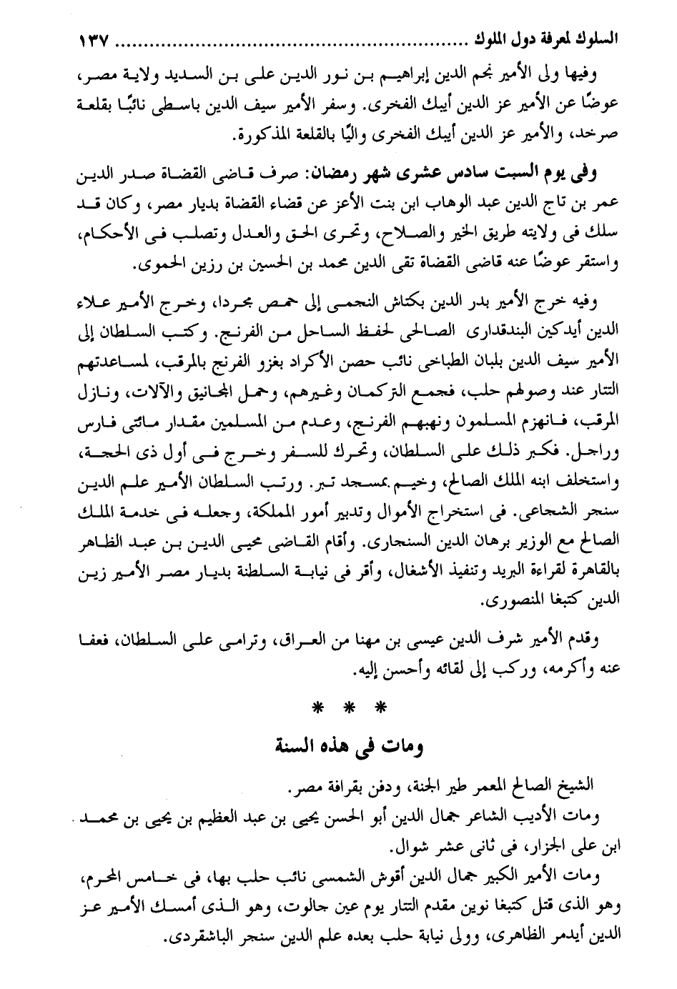 وفيهَا ولي الْأَمِير نجم الدّين إِبْرَاهِيم بن نور الدّين على بن السديد ولَايَة مصر عوضا عَن الْأَمِير عز الدّين أيبك الفخري. وسفر الْأَمِير سيف الدّين باسطي نَائِبا بقلعة صرخد والأمير عز الدّين أيبك الفخري والياً بالقلعة الْمَذْكُورَة. وَفِي يَوْم السبت سادس عشري شهر رَمَضَان: صرف قَاضِي الْقُضَاة صدر الدّين عمر بن تَاج الدّين عبد الْوَهَّاب ابْن بنت الْأَعَز عَن قَضَاء الْقُضَاة بديار مصر وَكَانَ قد سلك فِي ولَايَته طَرِيق الْخَيْر وَالصَّلَاح وتحري الْحق وَالْعدْل وتصلب فِي الْأَحْكَام وَاسْتقر عوضا عَنهُ قَاضِي الْقُضَاة تَقِيّ الدّين مُحَمَّد بن الْحُسَيْن بن رزين الْحَمَوِيّ. وَفِيه خرج الْأَمِير بدر الدّين بكتاش النجمي إِلَى حمص مُجَردا وَخرج الْأَمِير عَلَاء الدّين أيدكين البندقداري الصَّالِحِي لحفظ السَّاحِل من الفرنج. وَكتب السُّلْطَان إِلَى الْأَمِير سيف الدّين بلبان الطباخي نَائِب حصن الأكراد بغزو الفرنج بالمرقب لمساعدتهم التتار عِنْد وصولهم حلب فَجمع التركمان وَغَيرهم وَحمل المجانيق والآلات ونازل المرقب فَانْهَزَمَ الْمُسلمُونَ ونهبهم الفرنج وَعدم من الْمُسلمين مِقْدَار مِائَتي فَارس وراجل. فَكبر ذَلِك على السُّلْطَان وتحرك للسَّفر وَخرج فِي أول ذِي الْحجَّة واستخلف ابْنه الْملك الصَّالح وخيم بِمَسْجِد تبر. ورتب السُّلْطَان الْأَمِير علم الدّين سنجر الشجاعي. فِي اسْتِخْرَاج الْأَمْوَال وتدبير أُمُور المملكة وَجعله فِي خدمَة الْملك الصَّالح مَعَ الْوَزير برهَان الدّين السنجاري. وَأقَام القَاضِي محيي الدّين بن عبد الظَّاهِر بِالْقَاهِرَةِ لقِرَاءَة الْبَرِيد وتنفيذ الأشغال وَأقر فِي نِيَابَة السلطنة بديار مصر الْأَمِير زين الدّين كتبغا المنصوري. وَقدم الْأَمِير شرف الدّين عيسي بن مهنا من الْعرَاق وترامي على السُّلْطَان فَعَفَا عَنهُ وأكرمه وَركب إِلَى لِقَائِه وَأحسن إِلَيْهِ. وَمَات فِي هَذِه السّنة الشَّيْخ الصَّالح المعمر طير الْجنَّة وَدفن بقرافة مصر. وَمَات الأديب الشَّاعِر جمال الدّين أَبُو الْحسن يحيي بن عبد الْعَظِيم بن يحيي بن مُحَمَّد ابْن على الجزار فِي ثَانِي عشر شَوَّال. وَمَات الْأَمِير الْكَبِير جمال الدّين أقوش الشمسي نَائِب حلب بهَا فِي خَامِس الْمحرم وَهُوَ الَّذِي قتل كتبغا نوين مقدم التتار يَوْم عين جالوت وهر الَّذِي أمسك الْأَمِير عز الدّين أيدمر الظَّاهِرِيّ وَولي نِيَابَة حلب بعده علم الدّين سنجر الباشقردي.