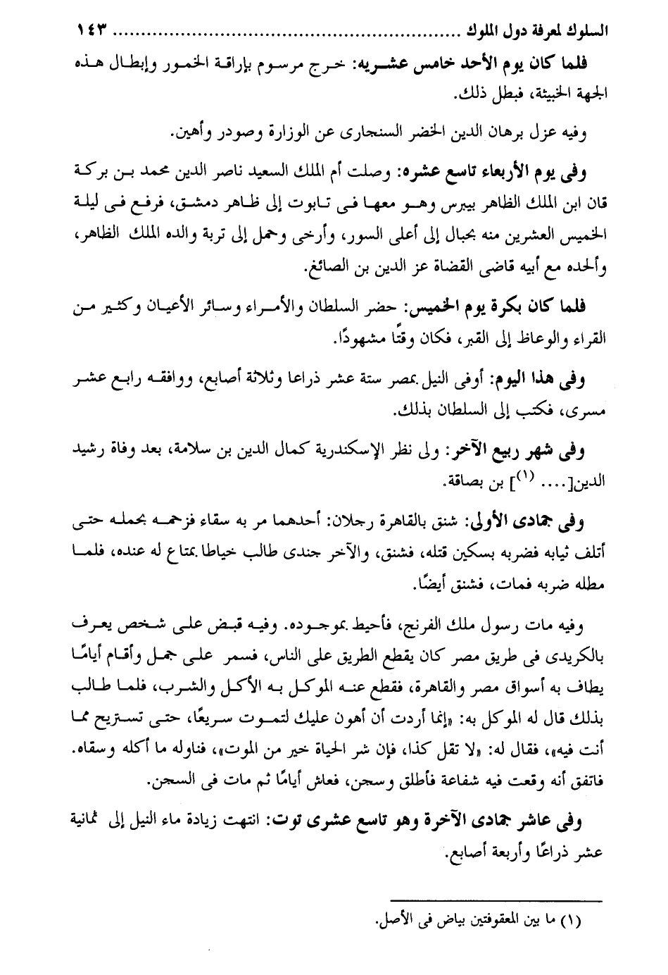 فَلَمَّا كَانَ يَوْم الْأَحَد خَامِس عشريه: خرج مرسوم بإراقة الْخُمُور وَإِبْطَال هَذِه الْجِهَة الخبيثة فَبَطل ذَلِك. وَفِيه عزل برهَان الدّين الْخضر السنجاري عَن الوزارة وصودر وأهين. وَفِي يَوْم الْأَرْبَعَاء تَاسِع عشره: وصلت أم الْملك السعيد نَاصِر الدّين مُحَمَّد بن بركَة قان ابْن الْملك الظَّاهِر بيبرس وَهُوَ مَعهَا فِي تَابُوت إِلَى ظَاهر دمشق فَرفع فِي لَيْلَة الْخَمِيس الْعشْرين مِنْهُ بحبال إِلَى أَعلَى السُّور وأرخي وَحمل إِلَى تربة وَالِده الْملك الظَّاهِر وألحده مَعَ أَبِيه قَاضِي الْقُضَاة عز الدّين بن الصَّائِغ. فَلَمَّا كمان بكرَة يَوْم الْخَمِيس: حضر السُّلْطَان والأمراء وَسَائِر الْأَعْيَان وَكثير من الْقُرَّاء والوعاظ إِلَى الْقَبْر فَكَانَ وقتا مشهوداً. وَفِي هَذَا الْيَوْم: أوفي النّيل بِمصْر سِتَّة عشر ذِرَاعا وَثَلَاثَة أَصَابِع وَوَافَقَهُ رَابِع عشر مسري فَكتب إِلَى السُّلْطَان بذلك. وَفِي شهر ربيع الآخر ولي نظر الْإسْكَنْدَريَّة كَمَال الدّين بن سَلامَة بعد وَفَاة رشيد الدّين بن بصاقة. وَفِي جُمَادَى الأولى. شنق بِالْقَاهِرَةِ رجلَانِ. أَحدهمَا مر بِهِ سقاء فزحمه بِحمْلِهِ حَتَّى أتلف ثِيَابه فَضَربهُ بسكين قَتله فشنق وَالْآخر جندي طَالب خياطا بمتاع لَهُ عِنْده فَلَمَّا مطله ضربه فَمَاتَ فشنق أَيْضا. وَفِيه مَاتَ رَسُول ملك الفرنج فأحيط بموجوده. وَفِيه قبض على شخص يعرف بالكريدي فِي طَرِيق مصر كَانَ يقطع الطَّرِيق على النَّاس فسمر على جمل وَأقَام أَيَّامًا يُطَاف بِهِ أسواق مصر والقاهرة فَقطع عَنهُ الْمُوكل بِهِ الْأكل وَالشرب فَلَمَّا طَالب بذلك قَالَ لَهُ الْمُوكل بِهِ: إِنَّمَا أردْت أَن أَهْون عَلَيْك لتَمُوت سَرِيعا حَتَّى تستريح مِمَّا أَنْت فِيهِ فَقَالَ لَهُ: لَا تقل كَذَا فَإِن شَرّ الْحَيَاة خير من الْمَوْت فَنَاوَلَهُ مَا أكله وسقاه. فاتفق إِنَّه وَقعت فِيهِ شَفَاعَة فَأطلق وسجن فَعَاشَ أَيَّامًا ثمَّ مَاتَ فِي السجْن. وَفِي عَاشر جُمَادَى الْآخِرَة وَهُوَ تَاسِع عشري توت: انْتَهَت زِيَادَة مَاء النّيل إِلَى ثَمَانِيَة عشر ذِرَاعا وَأَرْبَعَة أَصَابِع.