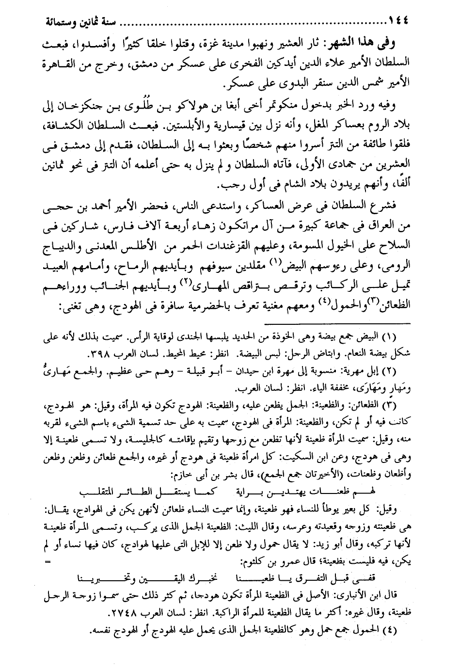 وَفِي هَذَا الشَّهْر: ثار العشير ونهبوا مَدِينَة غَزَّة وَقتلُوا خلقا كثيرا وأفسدوا فَبعث السُّلْطَان الْأَمِير عَلَاء الدّين أيدكين الفخري على عَسْكَر من دمشق وَخرج من الْقَاهِرَة الْأَمِير شمس الدّين سنقر البدوي على عَسْكَر. وَفِيه ورد الْخَبَر بِدُخُول منكوتمر أخي ابغا بن هولاكو بن طلوي بن جنكزخان إِلَى بِلَاد الرّوم بعساكر الْمغل وَأَنه نزل بَين قيسارية والأبلستين. فَبعث السُّلْطَان الكشافة فَلَقوا طَائِفَة من التتر أَسرُّوا مِنْهُم شخصا وبعثوا بِهِ إِلَى السُّلْطَان فَقدم إِلَى دمشق فِي الْعشْرين من جُمَادَى الأولى فآتاه السُّلْطَان وَلم ينزل بِهِ حَتَّى أعلمهُ أَن التتر فِي نَحْو ثَمَانِينَ ألفا وَإِنَّهُم يُرِيدُونَ بِلَاد الشَّام فِي أول فشرع السُّلْطَان فِي عرض العساكر واستدعى النَّاس فَحَضَرَ الْأَمِير أَحْمد بن حجي من الْعرَاق فِي جمَاعَة كَبِيرَة من آل مراتكون زهاء أَرْبَعَة آلَاف فَارس شاركين فِي السِّلَاح على الْخُيُول المسومة وَعَلَيْهِم القزغندات الْحمر من الأطلس المعدني والديباج الرُّومِي وعَلى رُءُوسهم الْبيض مقلدين سيوفهم وبأيديهم الرماح وأمامهم العبيد تميل على الركائب وترقص بتراقص المهاري وبأيديهم الجناب ووراءهم الظعائن والحمول وَمَعَهُمْ مغنية تعرف بالحضرمية سافرة فِي الهودج وَهِي تغني: